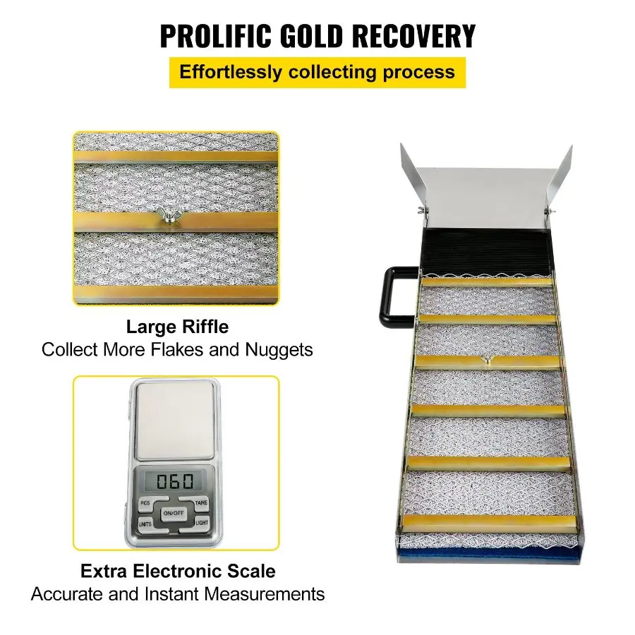 VEVOR Aluminum Alloy Sluice Box, Compact 30 Long Sluice Boxes for Gold, Lightweight Gold Sluice Equipment, Portable Sluice Boxes with Miner's Moss, River, Creek, Gold Panning, Prospecting, DredgingVEVOR Aluminum Alloy Sluice Box, Compact 36\" Mini Sluice Boxes for Gold, Lightweight Gold Sluice Equipment, Portable Sluice Boxes with Miner\'s Moss, River, Creek, Gold Panning, Prospecting, Dredging Compact Design Labor-Saving Tool Aluminum Alloy Construction Convenient