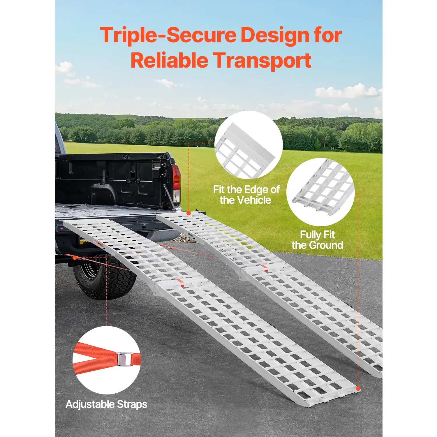 • Reinforced with Straps: Equipped with adjustable securing straps, the ramp firmly attaches to the pickup truck edge, minimizing movement and avoiding sliding or shifting during loading, ensuring stable and secure vehicle transport.