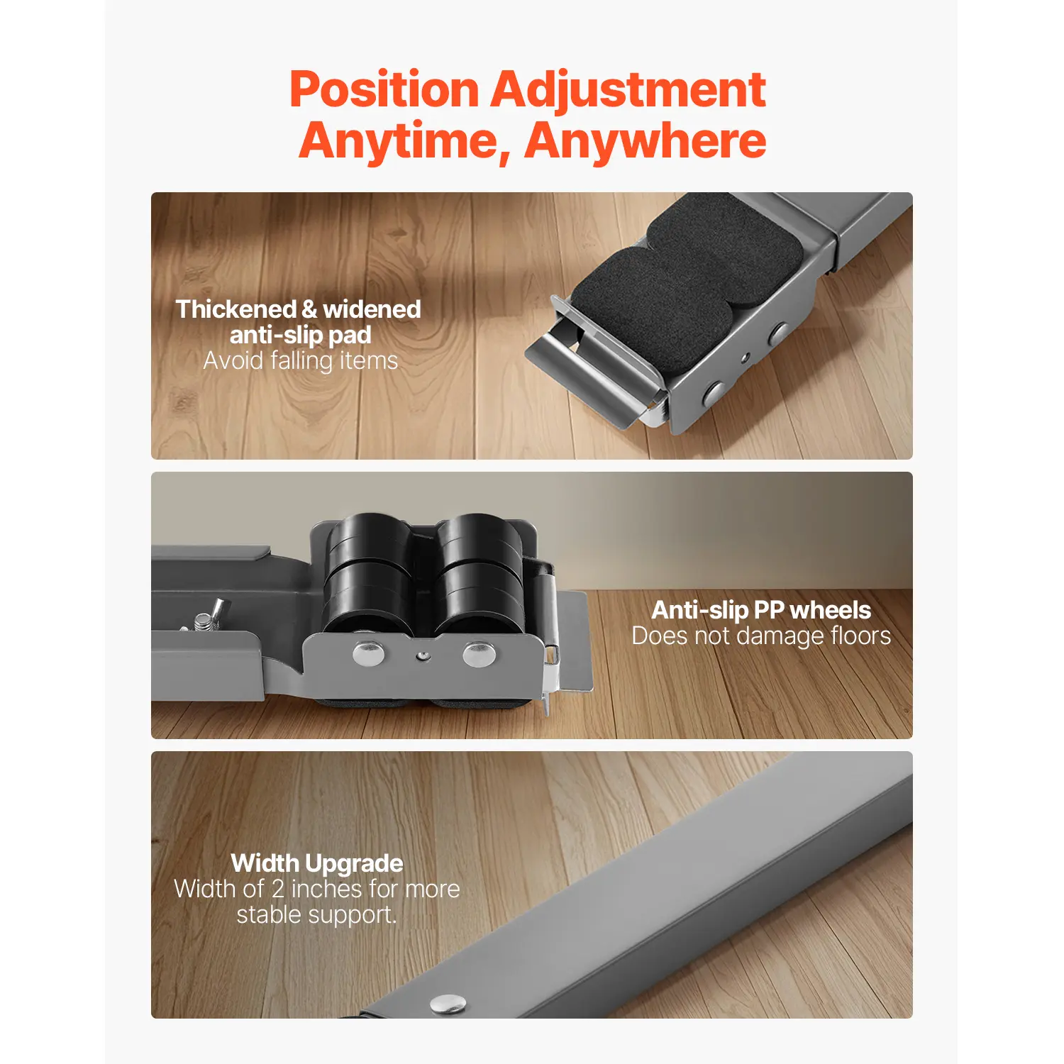 • Secure Movement: Easily adjust the base for cleaning, storage, or usage. The non-slip PP wheels won’t scratch your floors, and the upgraded anti-slip pads keep everything stable and secure.