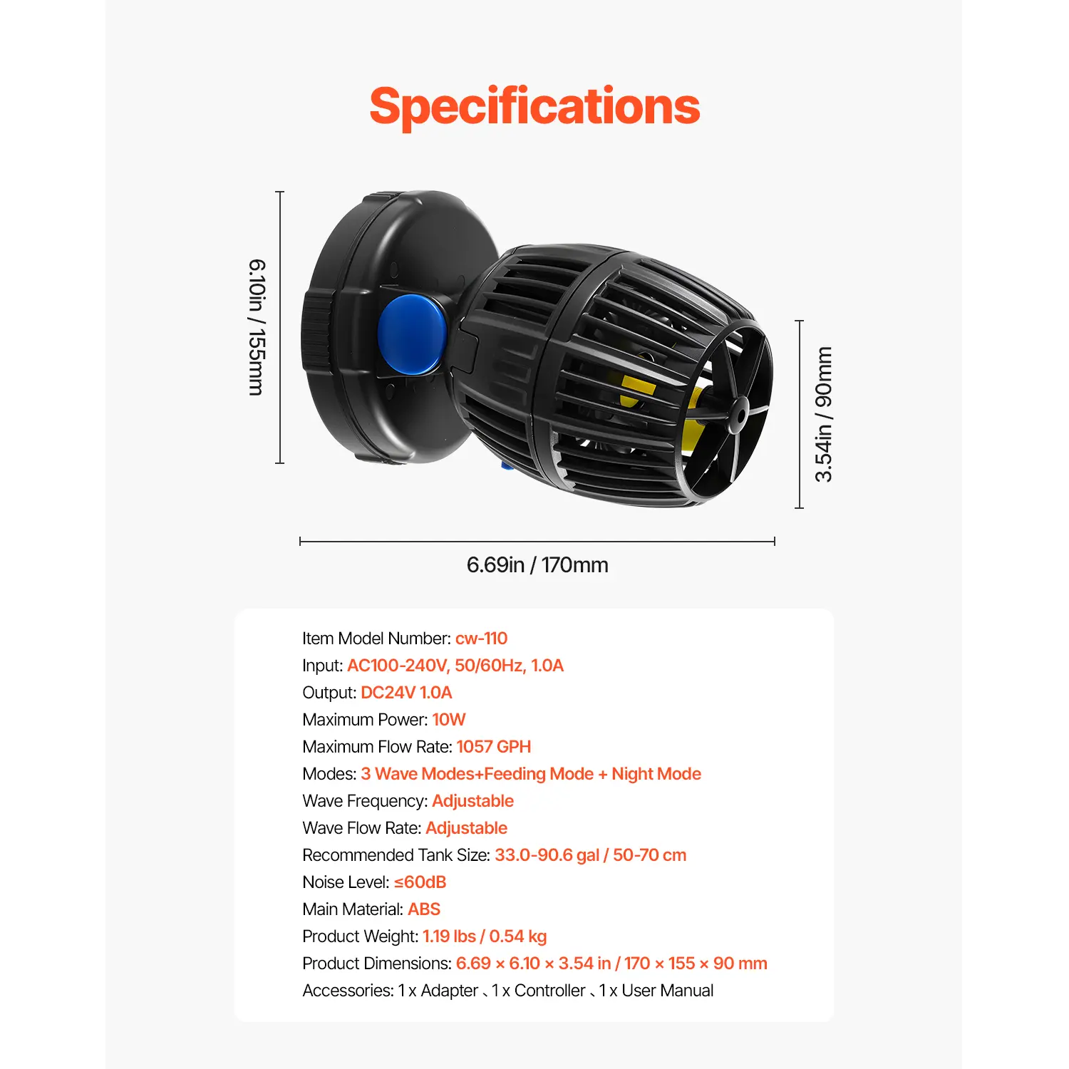 Designed for efficiency, this small yet powerful wave maker delivers up to 1057 GPH with only 10W of power consumption. Ideal for 50-70 cm aquariums, it operates securely with a 24V DC low-voltage power supply.