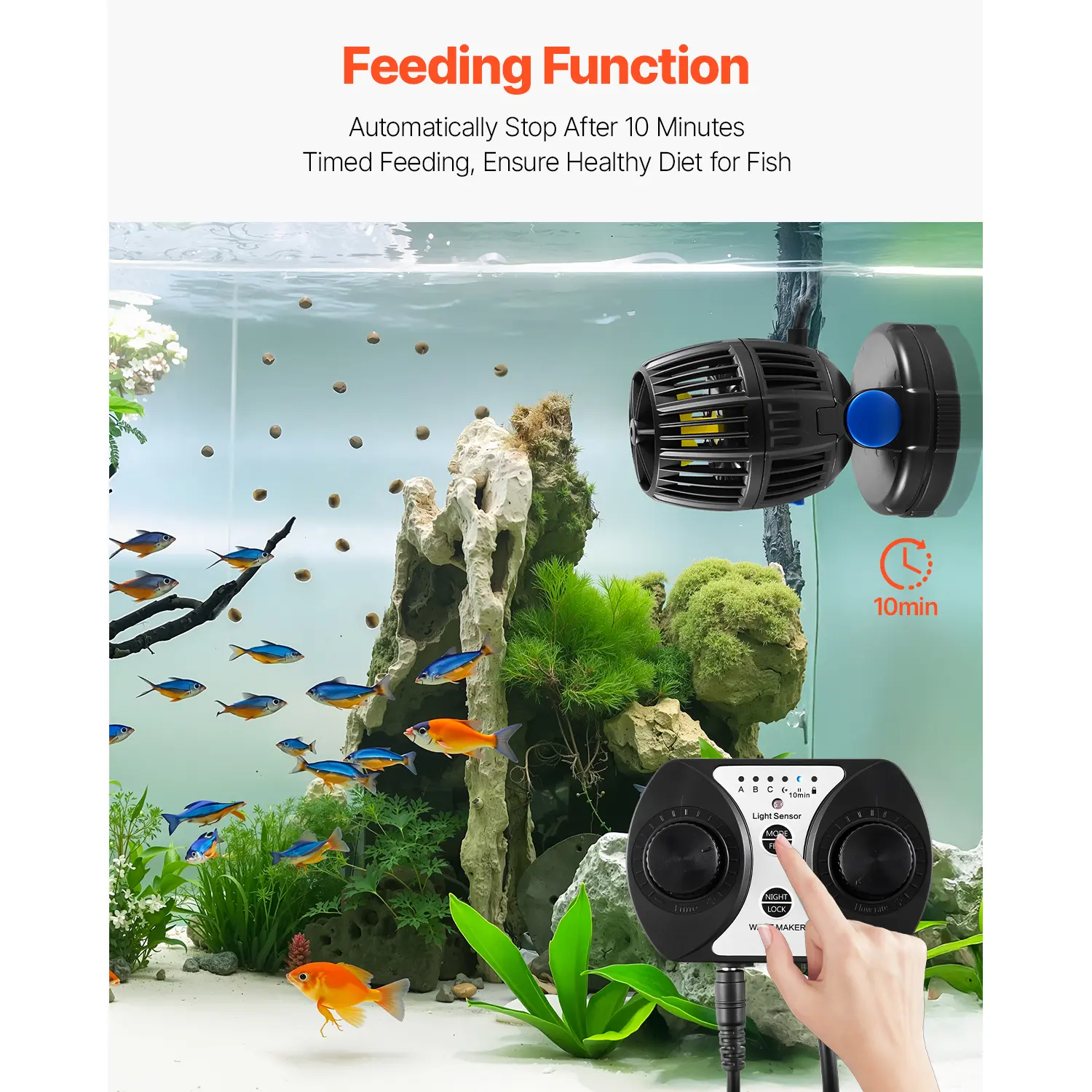 Take full control with our multi-functional controller! Adjust wave frequency and water flow rate with dual knobs. Additional features include feed mode, night mode, and key lock for added convenience. Manage your aquarium effortlessly.