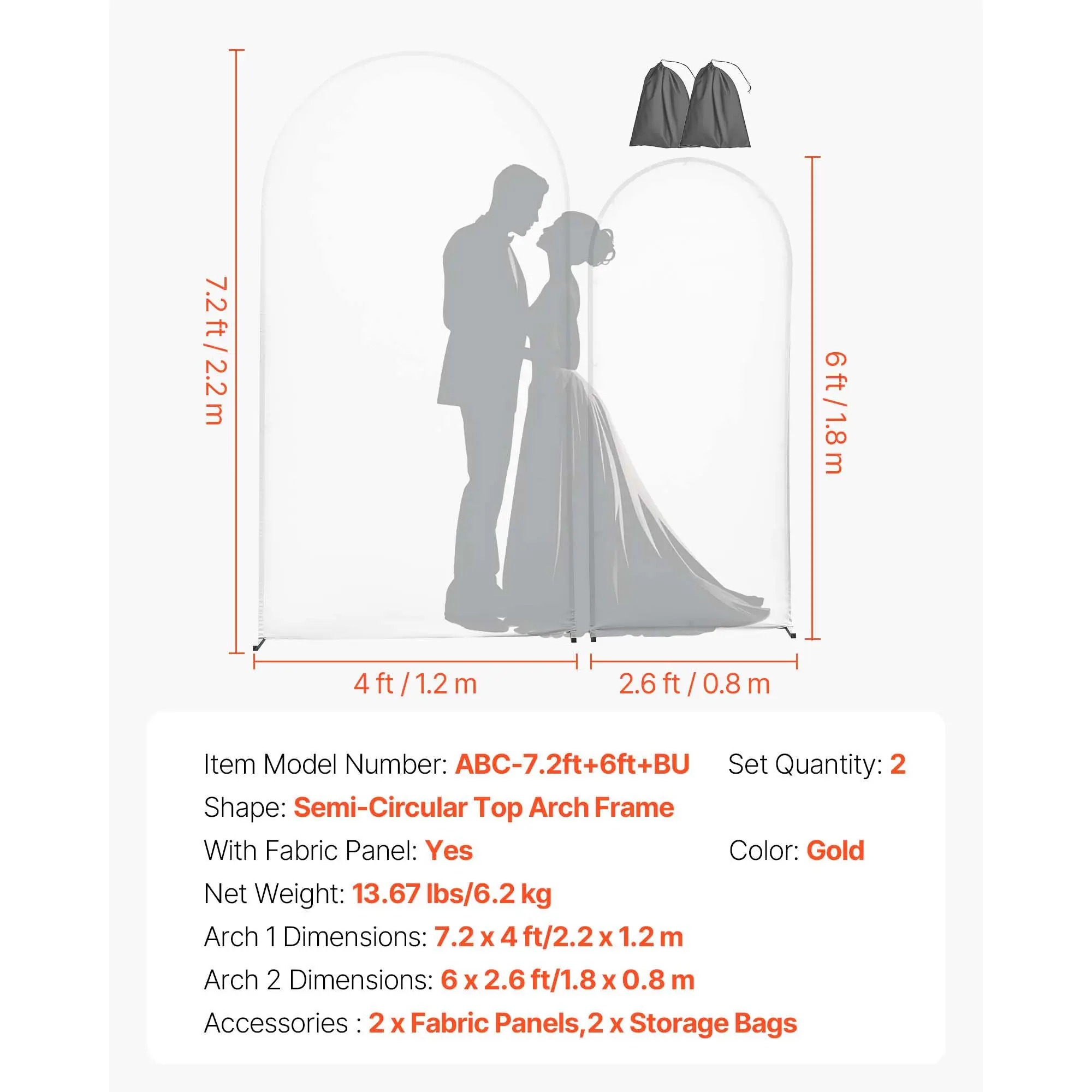 VEVOR Arch Backdrop Stand, Set of 2, 7.2 ft and 6 ft, Stable Structure, Easy Assembly, Gold Metal Arch Backdrop Stand with Cover for Wedding, Birthday Party, Celebration, and Ceremony Decoration
