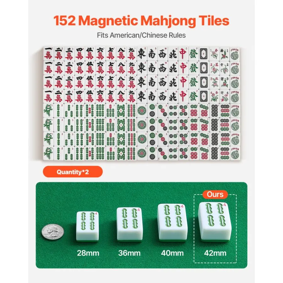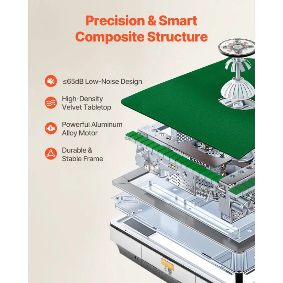 This automatic mahjong table features a 13.5 angled tile lift for smooth, natural dealing, automatic shuffling and dice rolling to free your hands, a complete tile set with clear patterns, 90 foldable frame with wheels for easy storage and movement, and a quiet shuffle system suitable for home, community, or club play.