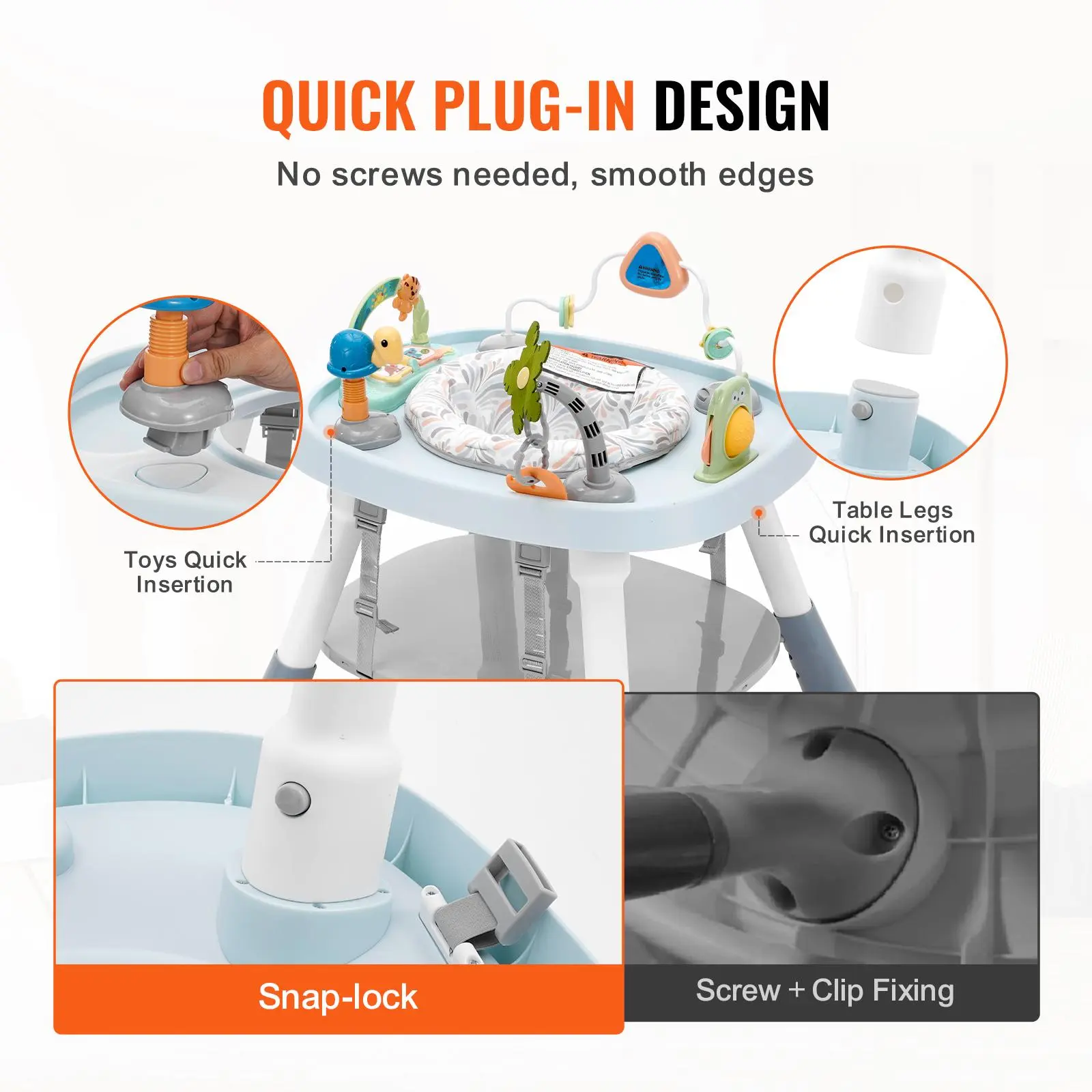 • Easy Assembly: This activity center jumper table legs and toys feature quick plug-in design. Assemble seat legs and platform, install seat and toys in one go, no need for a screwdriver. Smooth edges ensure safety for both babies and parents during assembly and use.