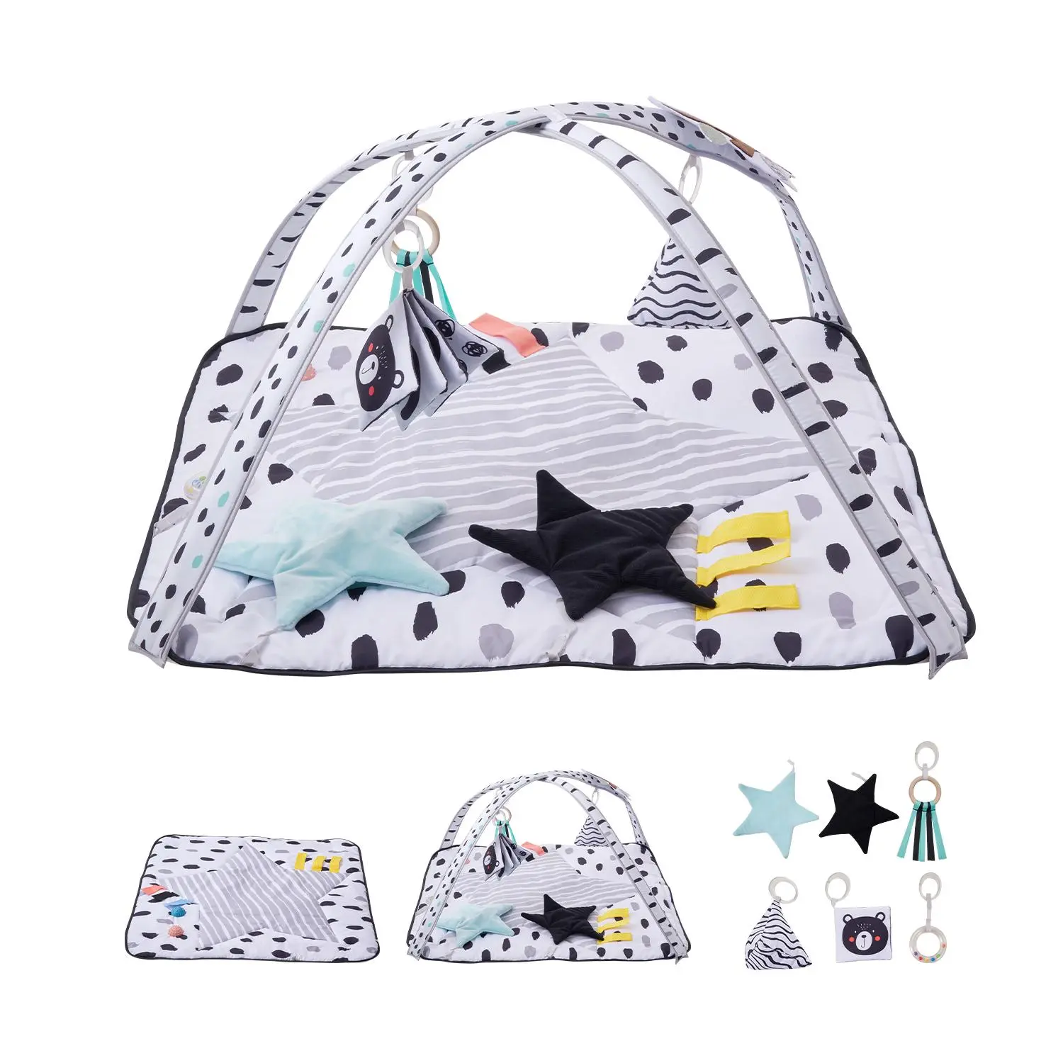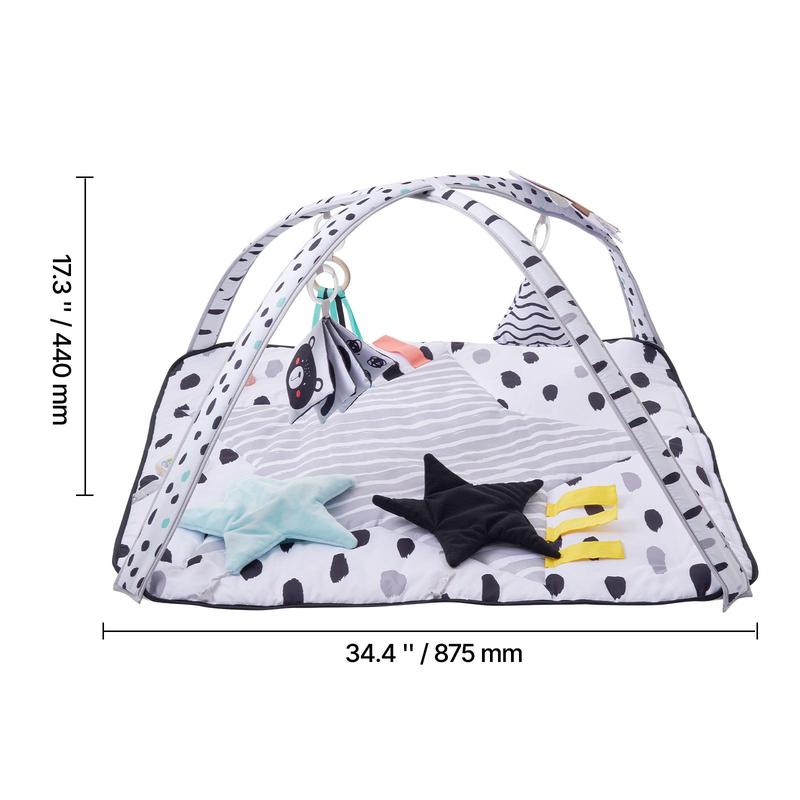 • 6 Sensory Toys & 2 Touch Balls: This tummy time play mat comes with 6 removable hanging toys that foster baby's overall sensory development and hand-eye coordination. 2 bumpy silicone balls and the triangular stack, ribbon, star, rattle toy, self-discovery mirror, and cloth book stimulate baby's tactile, auditory, visual, and cognitive development.