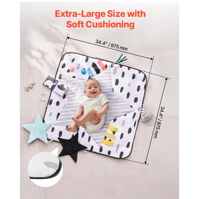 • Large Play Size: Our baby activity mat measures 34.4" x 34.4", offering a spacious and safe play area. Babies can freely lie down, roll over, and sit up, helping them explore the world in a comfortable environment.