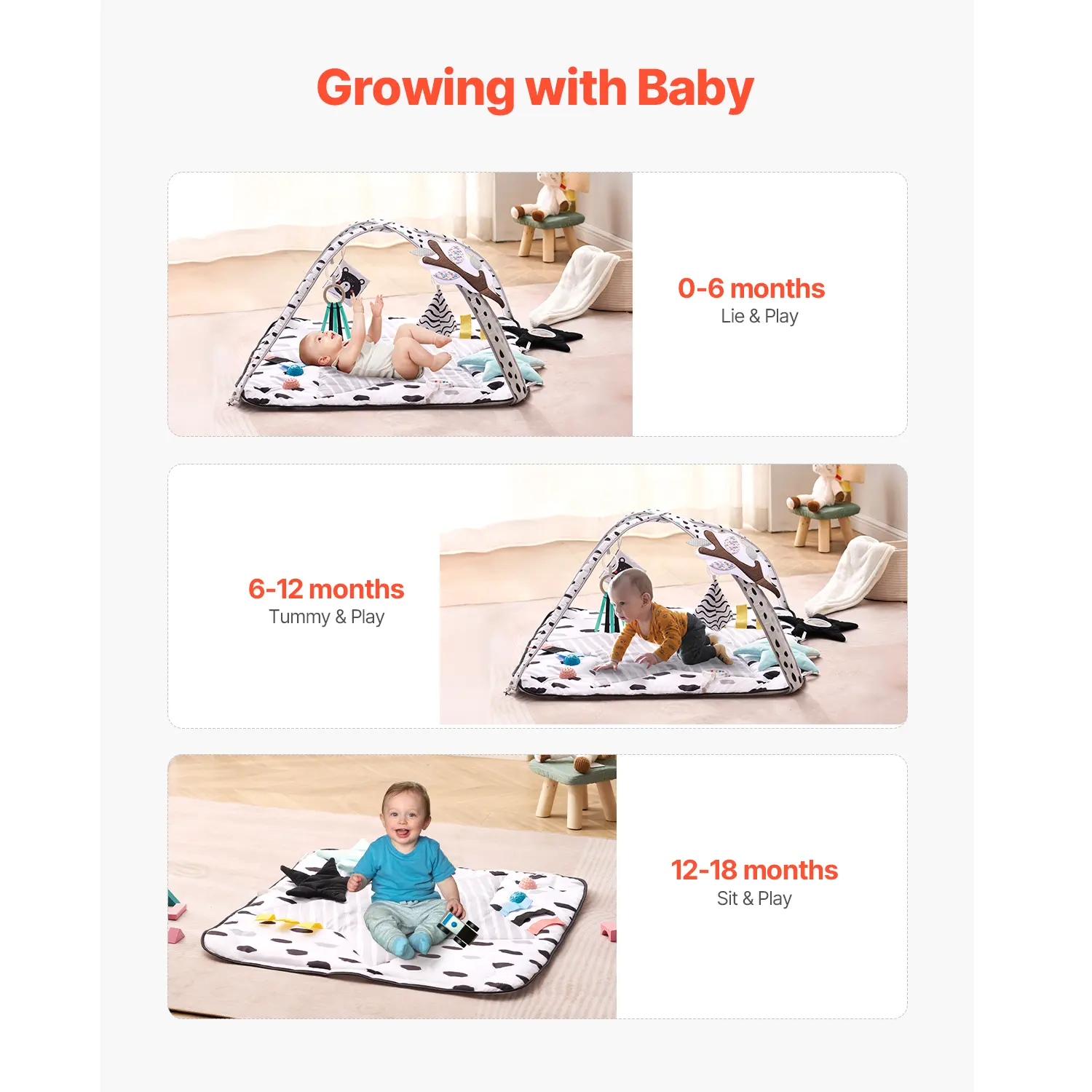 • Foster Your Baby's Growth: Designed for babies aged 0-18 months, this multi-functional baby play gym mat offers a comfortable space for rest, play, and learning. With 6 interactive toys and 2 touch balls, it promotes baby's sensory development and motor skills, helping babies practice crawling, sitting, grasping, and more.