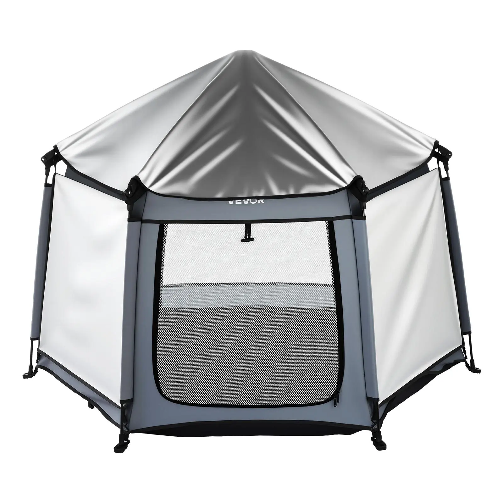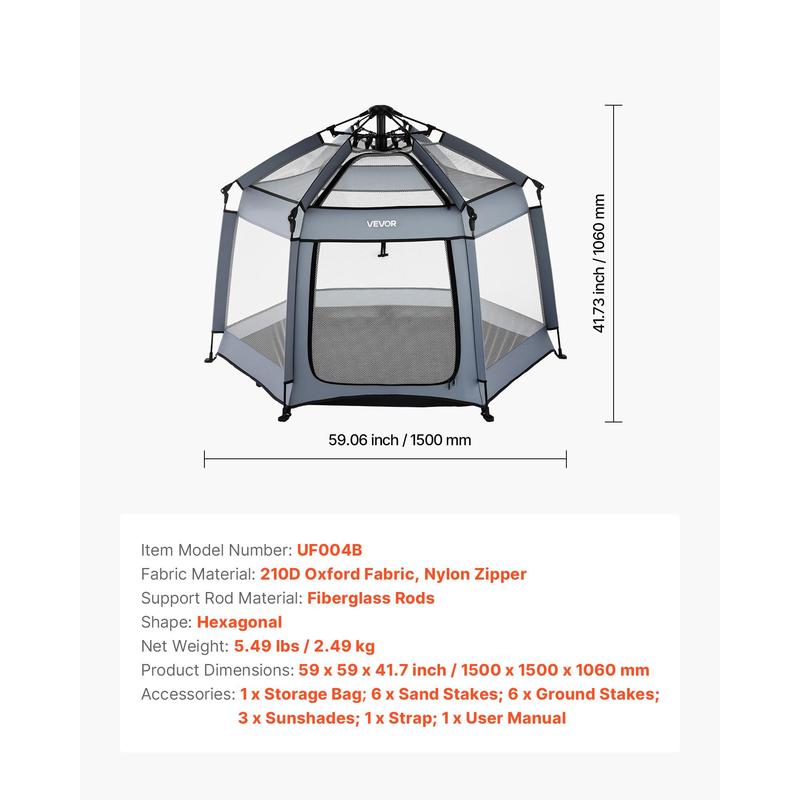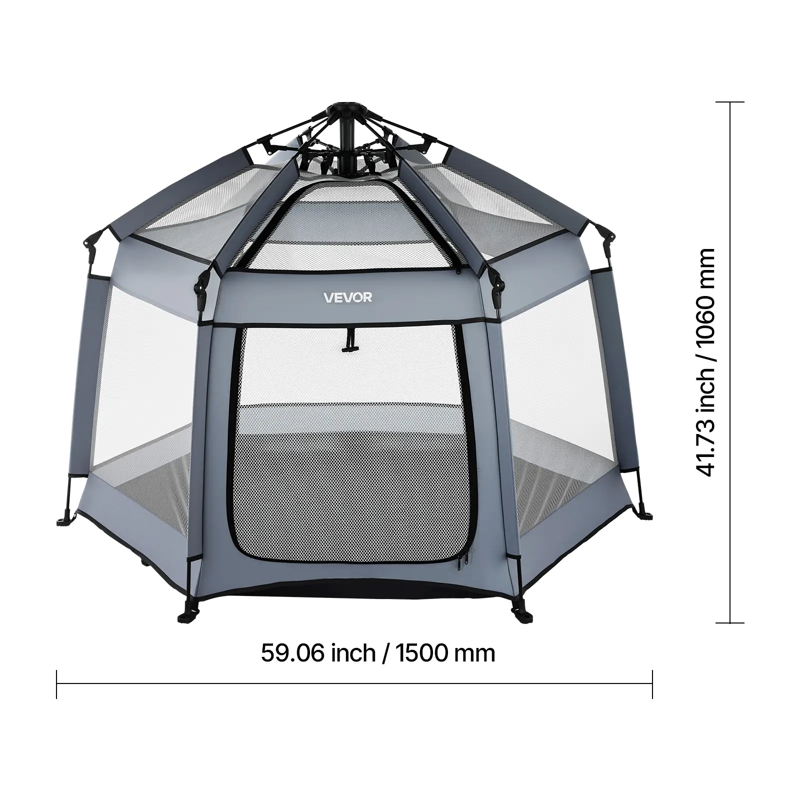 VEVOR 59 x 59 inch (1500 x 1500 mm) baby playpen with canopy offers a safe play space for babies aged 0 to 24 months. It provides ample room for crawling, standing, practicing walking, and playing, encouraging healthy development. The play mat is not included; please prepare it separately. This medium-sized playpen frees your hands, making it perfect for indoor and outdoor use.