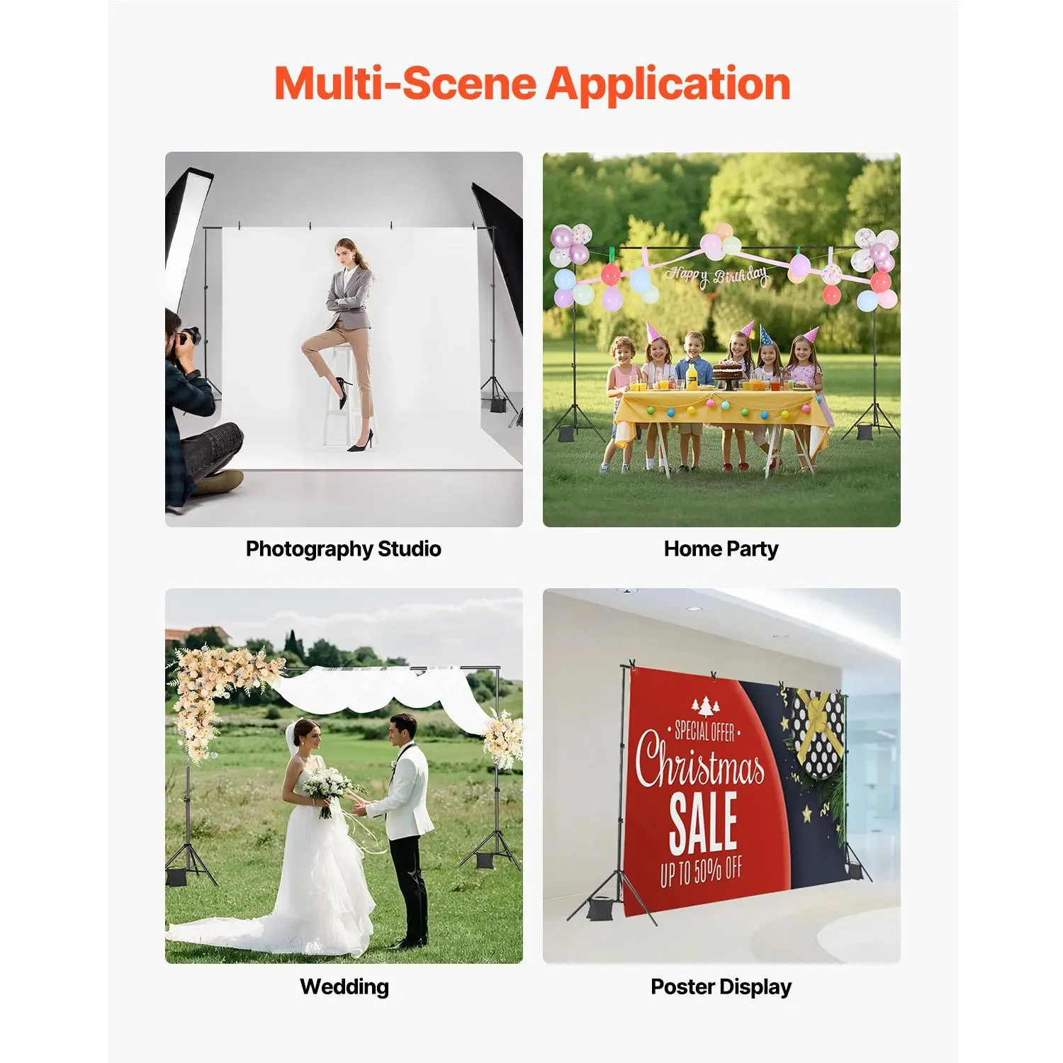 Setting up the perfect photo backdrop shouldn't be a hassle, whether you're prepping for a party or a professional shoot. The VEVOR Backdrop Stand Kit offers a sturdy, adjustable solution that fits backdrops up to 6.5 x 10 ft. Its heavy-duty carbon steel base supports up to 10 lbs, ensuring your backdrop stays put, even fully extended. The adjustable poles extend from 2.4 ft to 6.5 ft, so you can customize the size to your backdrop needs. Assembly is a breeze with spring-loaded pins—no tools required—making it easy to set up or pack away quickly. Plus, the included clips hold your backdrop flat and wrinkle-free, while sandbags add extra weight for outdoor stability. The whole kit fits neatly into a carrying bag, making it ideal for photographers, party planners, and event pros on the go. Note that backdrop fabric and decorations are not included, so you can choose your favorite style. Ready to create stunning backgrounds effortlessly? Grab this reliable backdrop stand and elevate your photo game today!