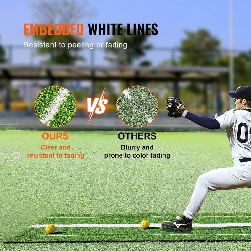 VEVOR 10x3ft Softball/Baseball Pitching Mat with Rubber Mound - Anti - Fade Turf Anti - Slip Foam Backing, Portable Fastpitch Training Aid for Indoor/Outdoor Practice (Red/Green)Baseball Pitching MatThis baseball pitching mat provides ample space for practicing various baseball pitching techniques. Its standard size spacing rubber mat and stride line design for pitching with better power can help you improve pitching accuracy and performance.SpecificationsItem Model Number: GPB1003Hitting Mat