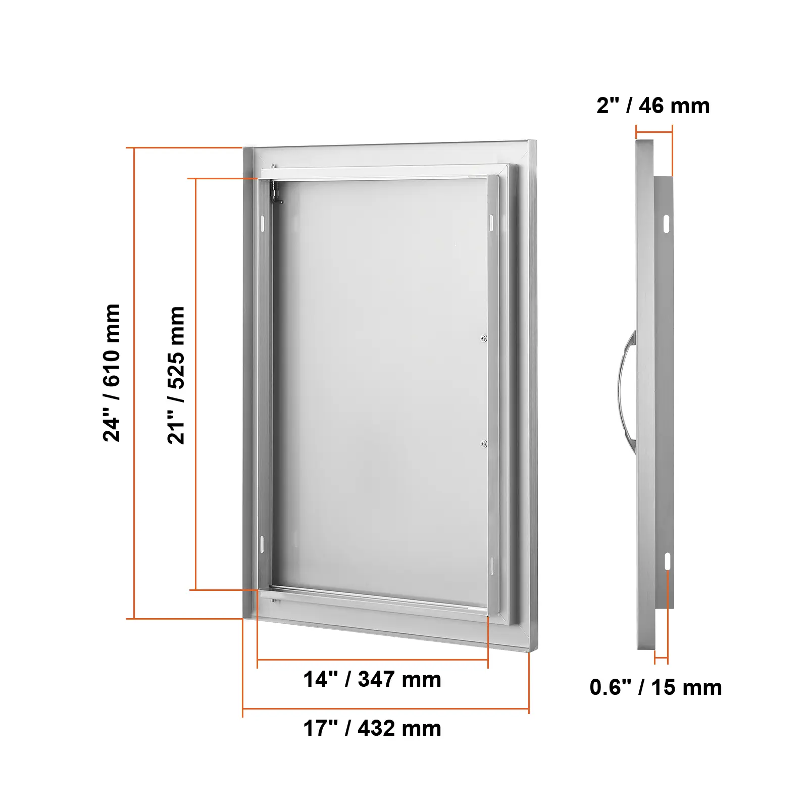 • Precision Opening: Overall dimensions: 432x610x46 mm / 17x24x2 inches, installation size: 14x21inch/347x525mm, it is recommended to reserve an additional 0.08inch/2mm on this basis for better operation. The door is designed specifically for outdoor kitchens and barbecue islands, adding an elegant touch to your cooking area. With precise dimensions, it is easy to process, install, or dismantle. Available in various sizes and styles, it is perfect for indoor/outdoor kitchens and all other outdoor weather conditions.