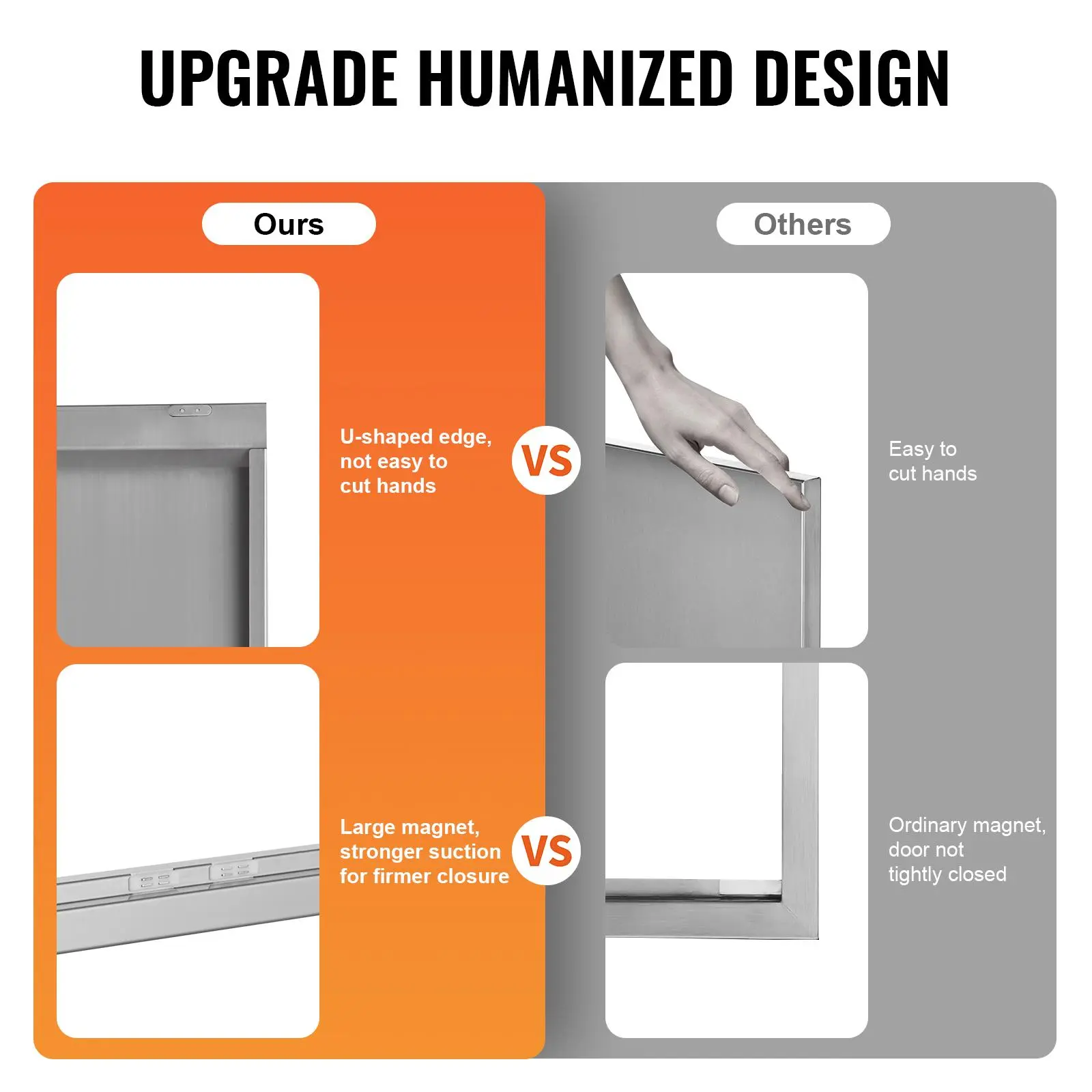 • High-quality Materials: This access door is made of sturdy high-quality stainless steel, rust-proof and waterproof. You can clean it well without leaving any traces. The integrated thickened frame structure is durable, with a fully seamless design, no sharp corners. The unique U-shaped panel structure provides better strength and durability. Magnets at the top and bottom keep the cabinet tightly closed, effectively preventing insects from accessing your food or anything inside the cabinet.