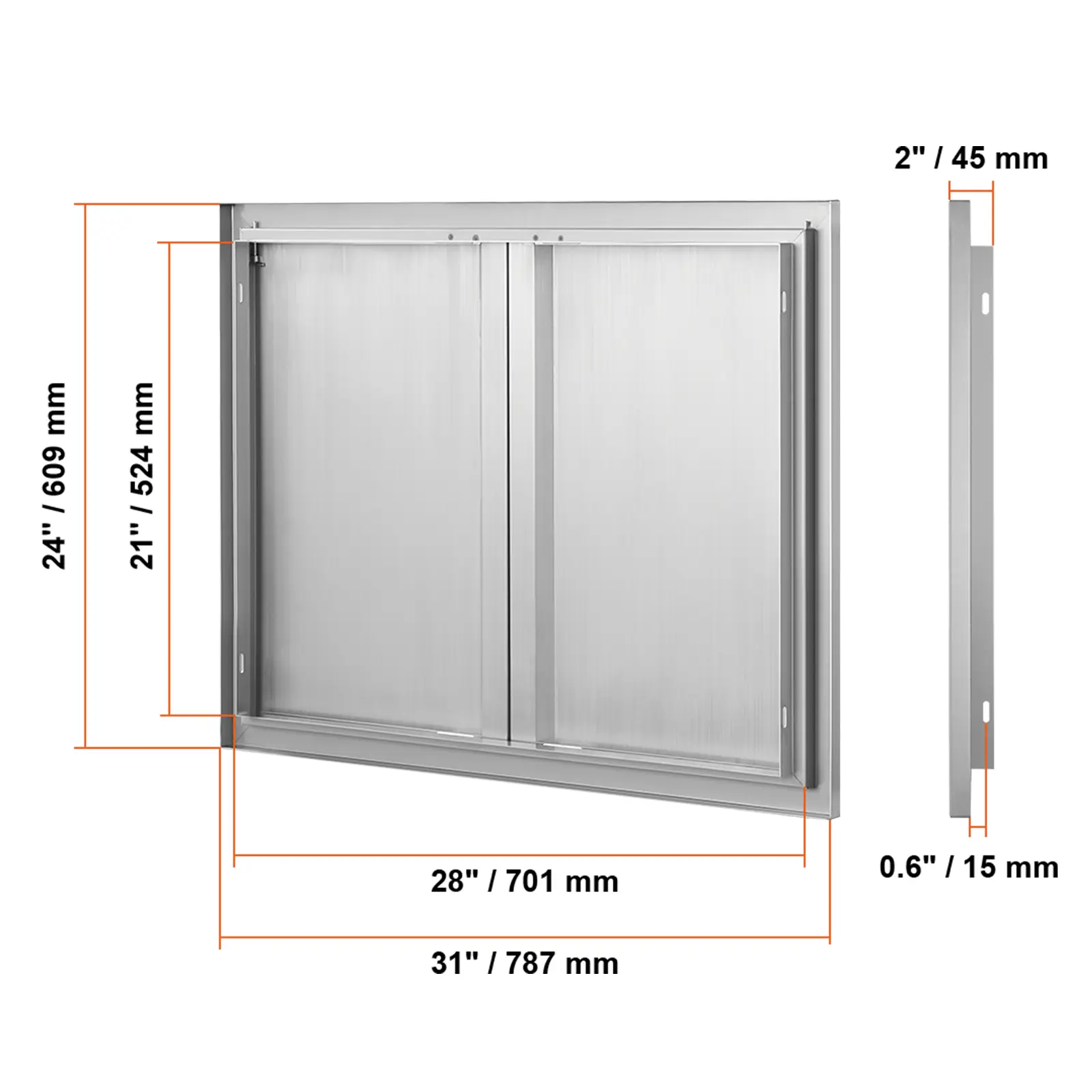 • Precision Opening: Overall dimensions: 787x609x45 mm / 31x24x2 inches, installation size: 28x21inch/701x524mm, it is recommended to reserve an additional 0.08inch/2mm on this basis for better operation. The door is designed specifically for outdoor kitchens and barbecue islands, adding an elegant touch to your cooking area. With precise dimensions, it is easy to process, install, or dismantle. Available in various sizes and styles, it is perfect for indoor/outdoor kitchens and all other outdoor weather conditions.