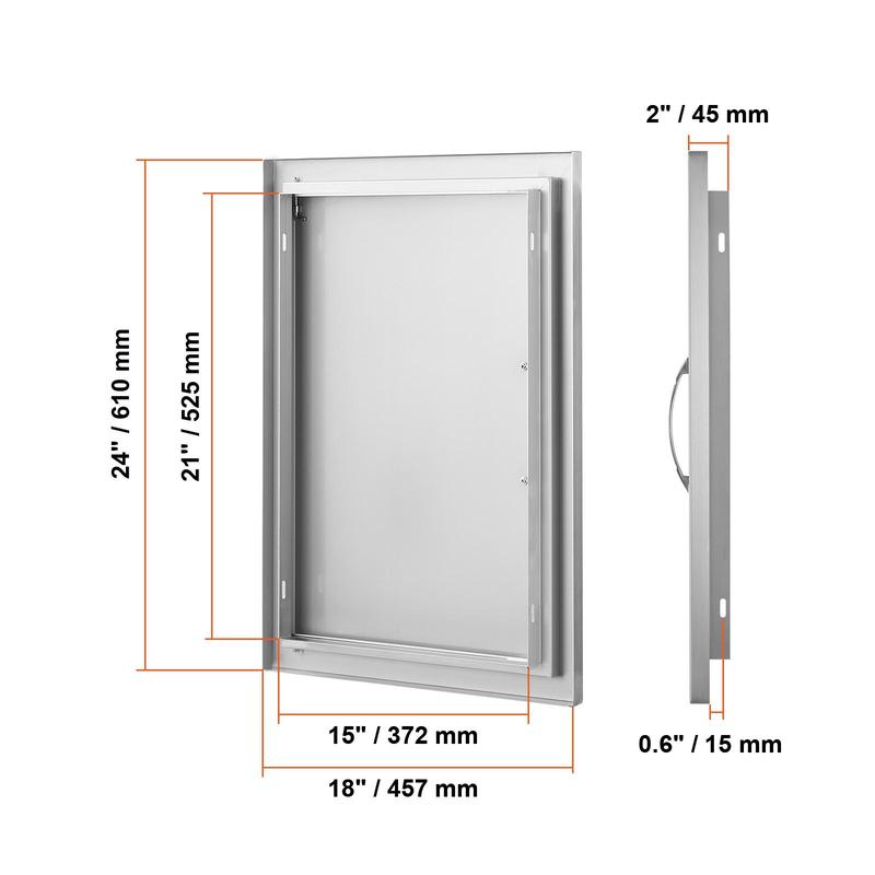 • Precision Opening: Overall dimensions: 457x610x45 mm / 18x24x2 inches, installation size: 15x21inch±0.08inch/372x525mm±2mm, it is recommended to reserve an additional 0.08inch/2mm on this basis for better operation. The door is designed specifically for outdoor kitchens and barbecue islands, adding an elegant touch to your cooking area. With precise dimensions, it is easy to process, install, or dismantle. Available in various sizes and styles, it is perfect for indoor/outdoor kitchens and all other outdoor weather conditions.
