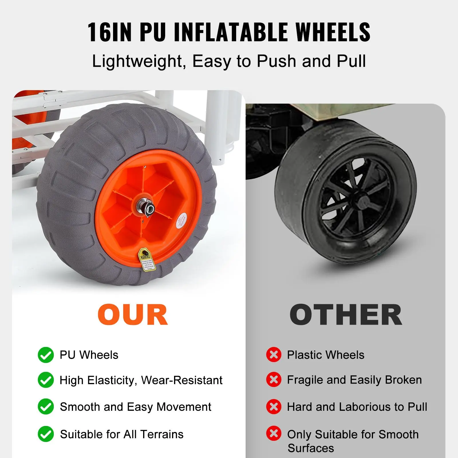 • Practical PU Wheels: This fishing beach cart is outfitted with 16-inch PU inflatable wheels that glide over sand, mud, gravel, and grass like a dream. These wheels don't just carry your load; they make your journey to the perfect fishing spot as smooth as your favorite fishing line.