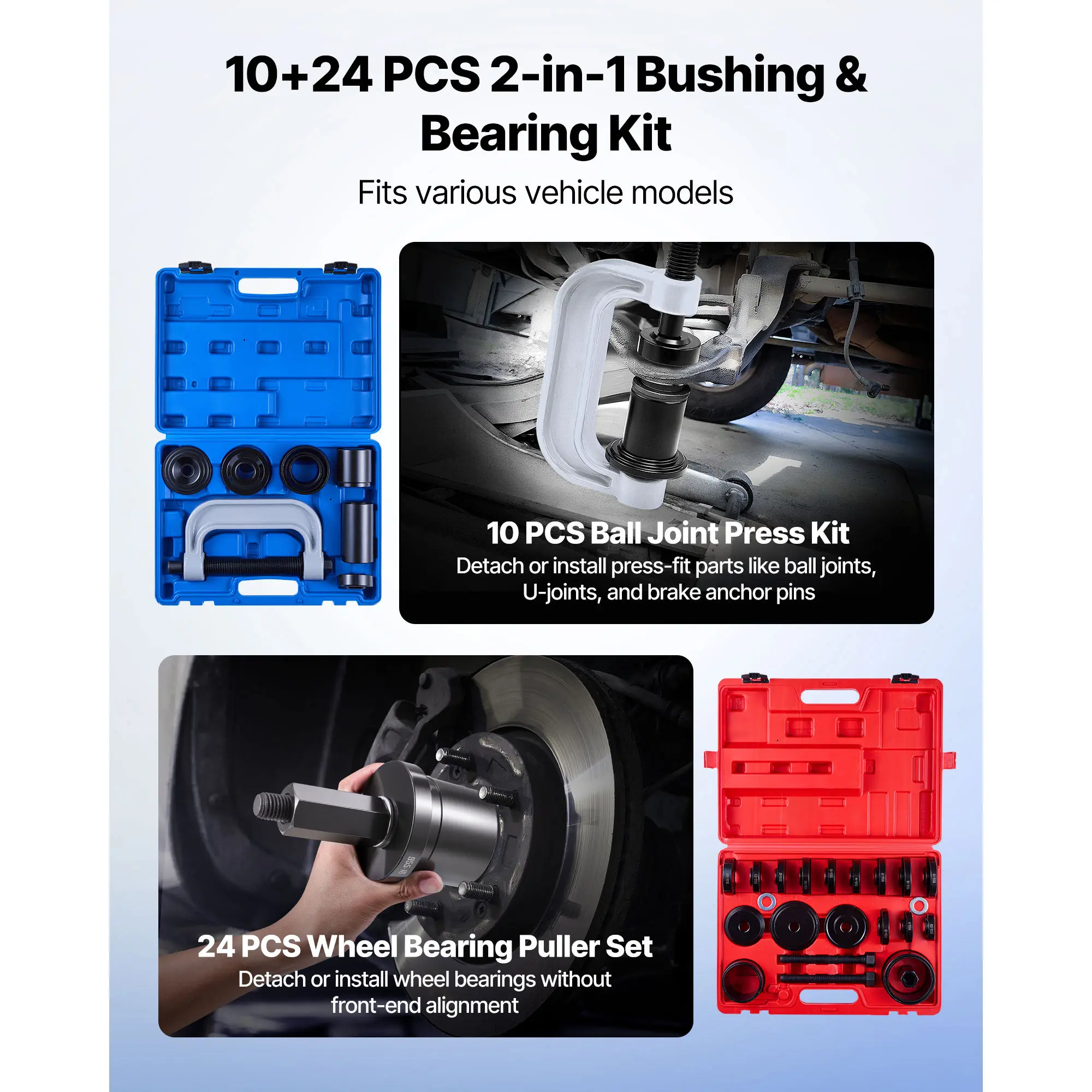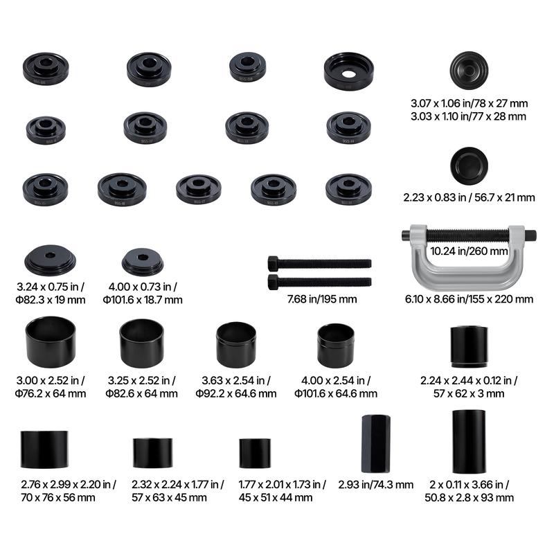 Our comprehensive bearing press kit includes 10 + 24 pcs of disc sleeve sizes and assembly accessories. It's perfect for handling various bearing disassembly tasks. The kit comes with a C-frame and sleeves, ensuring a complete set for heavy-duty removal and installation. This set is ideal for race and seal driver applications.