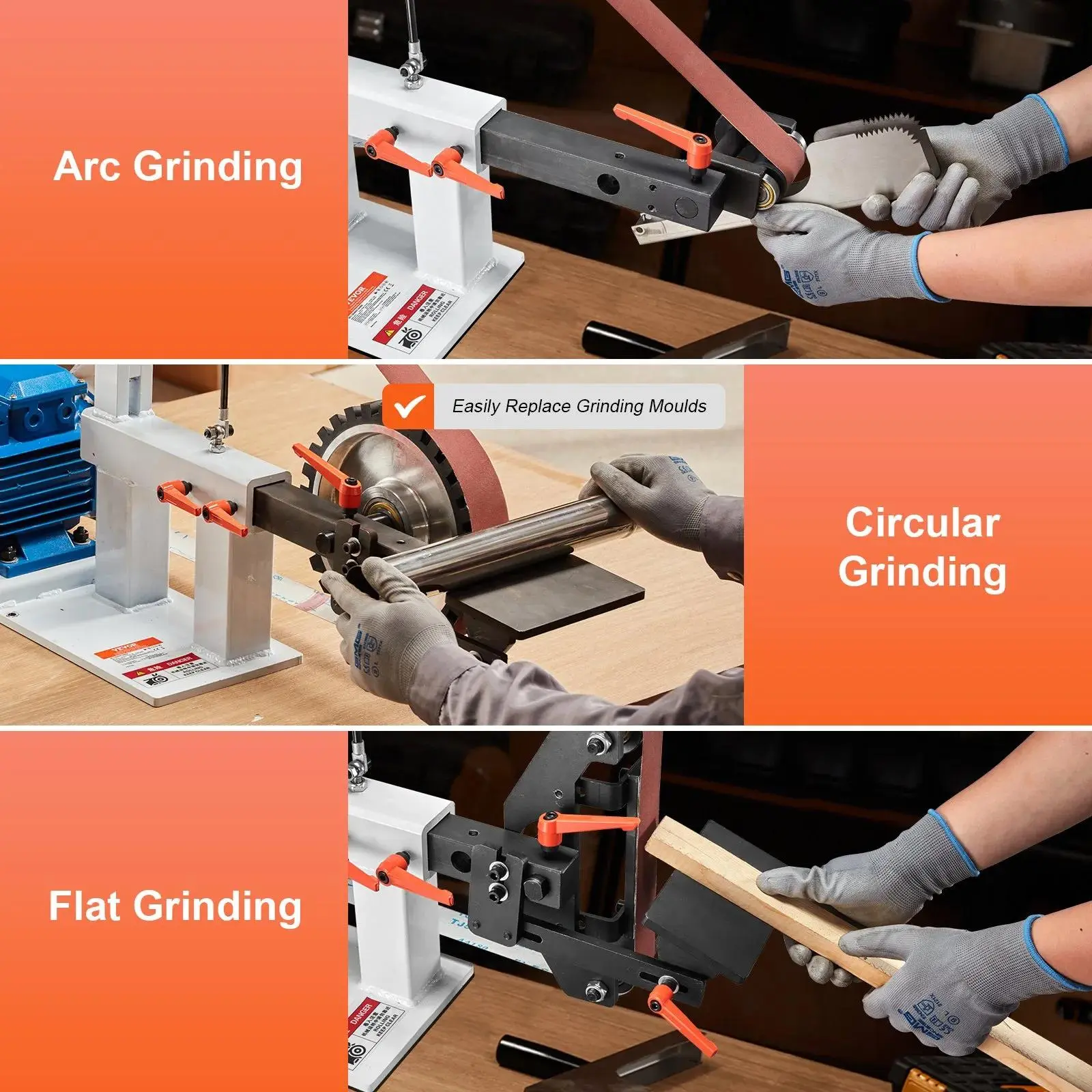 ·VEVOR bench belt sander offers 3 grinding modes: circular, arc, and flat grinding. It provides versatility for different applications. Whether grinding, polishing, or deburring metals, plastic, wood, glass, or other materials, this belt grinder is perfect for professional results.