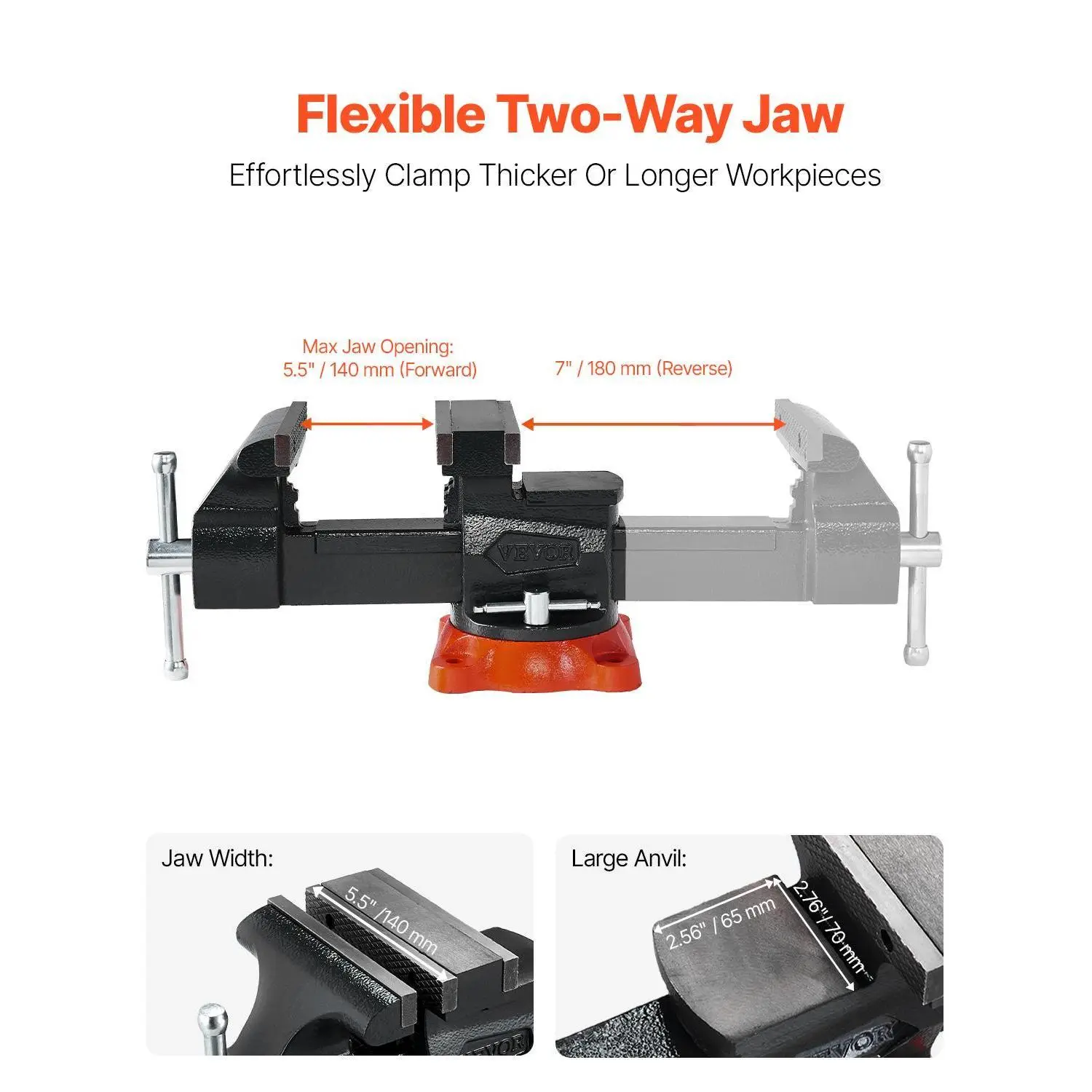 • Innovative Two-Way Jaw Design: Our multipurpose bench vise features an innovative two-way jaws, offering a 7" (180 mm) max jaw opening (reverse) and 5.5" (140 mm) max jaw opening (forward). Whether you're clamping large materials or delicate, precise workpieces, this vise adapts to your needs with ease. Enjoy greater flexibility and convenience!