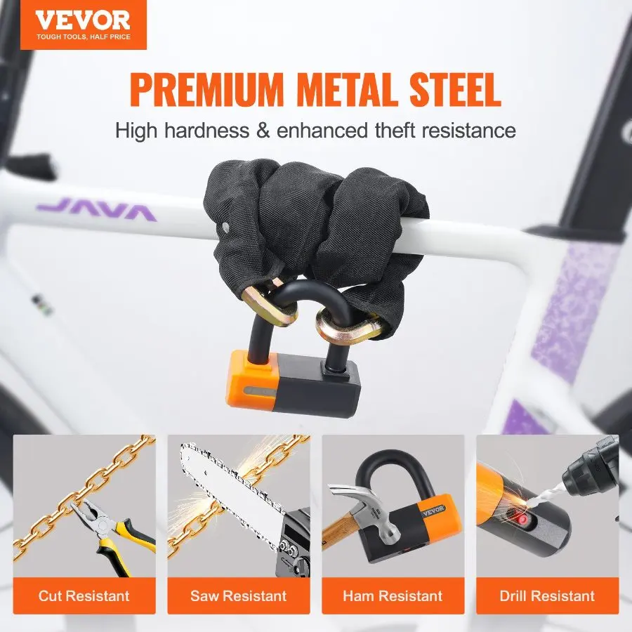 VEVOR Bike Chain Lock, 5.91 Ft Combination Bicycle Chain Lock with 4 Keys, Heavy Duty Anti - Theft High Security Bike Locks, Perfect for Bike, Motorcycle, Scooter, Bicycle, Door, Fence or Gate, 10mmVEVOR Bike Chain Lock, 3.28 Ft Bicycle Chain Lock with 4 Keys, Heavy Duty Metal Steel Anti-Theft High Security Bike Locks, Perfect for Bike, Motorcycle, Scooter, Bicycle, Door, Fence or Gate, 14mm Exceptional Security Convenient Carrying Simple Operation Extra Long Chain Flexible