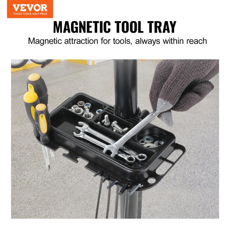 • Magnetic Tool Tray & Compact Storage: The bike mechanics stand includes a magnetic tool tray for convenient organization of small bike repair tools during maintenance. The magnetic design ensures that the tools stay in place. When not in use, the bike stand can be quickly folded and stored in your garage or trunk, taking up minimal space.