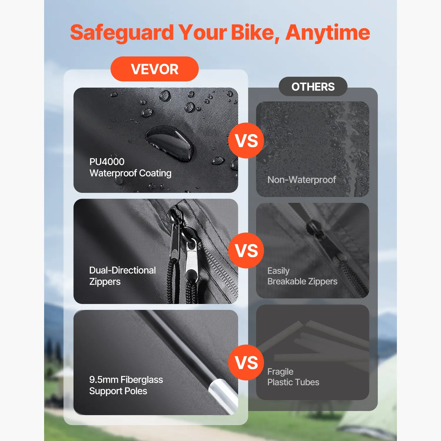 • Comprehensive Coverage: Our bike shed features a professional-grade dual waterproof coating and silver-coated 210D Oxford fabric. The outer layer of 210D silver-coated Oxford fabric combined with a PU4000 waterproof coating, full-coverage waterproof tape, and arched-top design avoid water pooling, keeping the interior dry. Sunshade material further extends its lifespan.