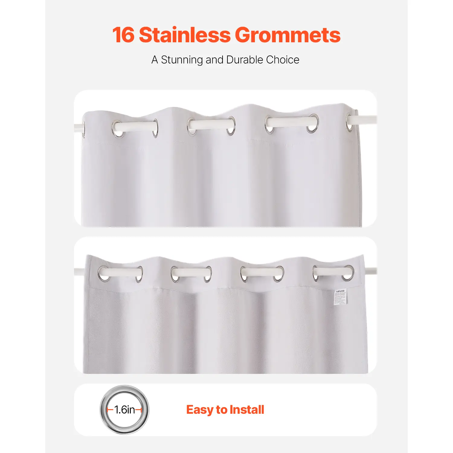 • Durable Grommet Design: Each panel is equipped with 8 sturdy stainless steel grommets (1.6-inch inner diameter) for effortless installation and smooth sliding. The rust-proof design ensures long-lasting durability, maintaining its flawless look even after extended use