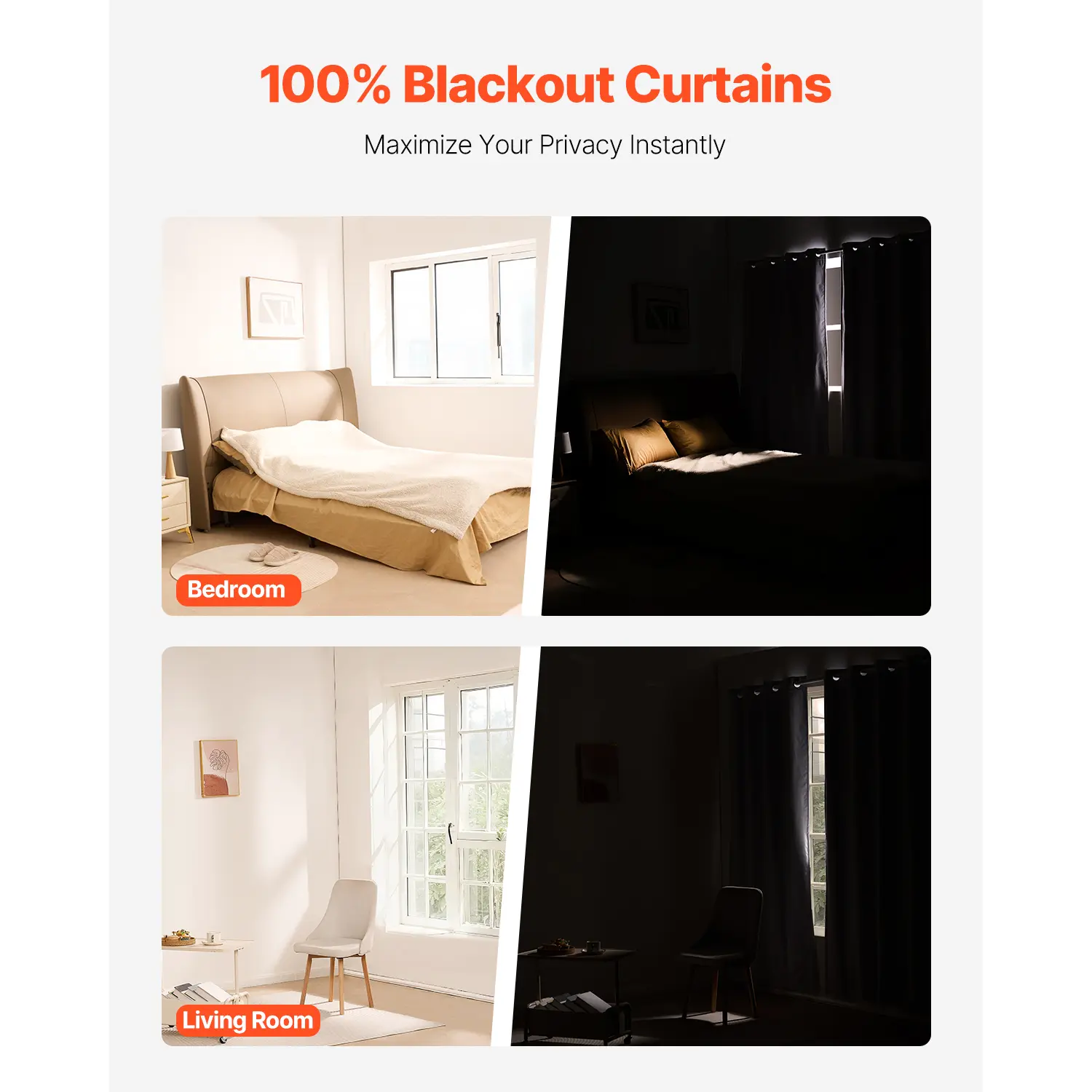 • Superior Blackout Performance: Our blackout curtains block 100% of sunlight, maximizing privacy and creating a pitch-dark environment instantly. They are suitable for bedrooms, living rooms, and other spaces where complete darkness is needed for quality sleep
