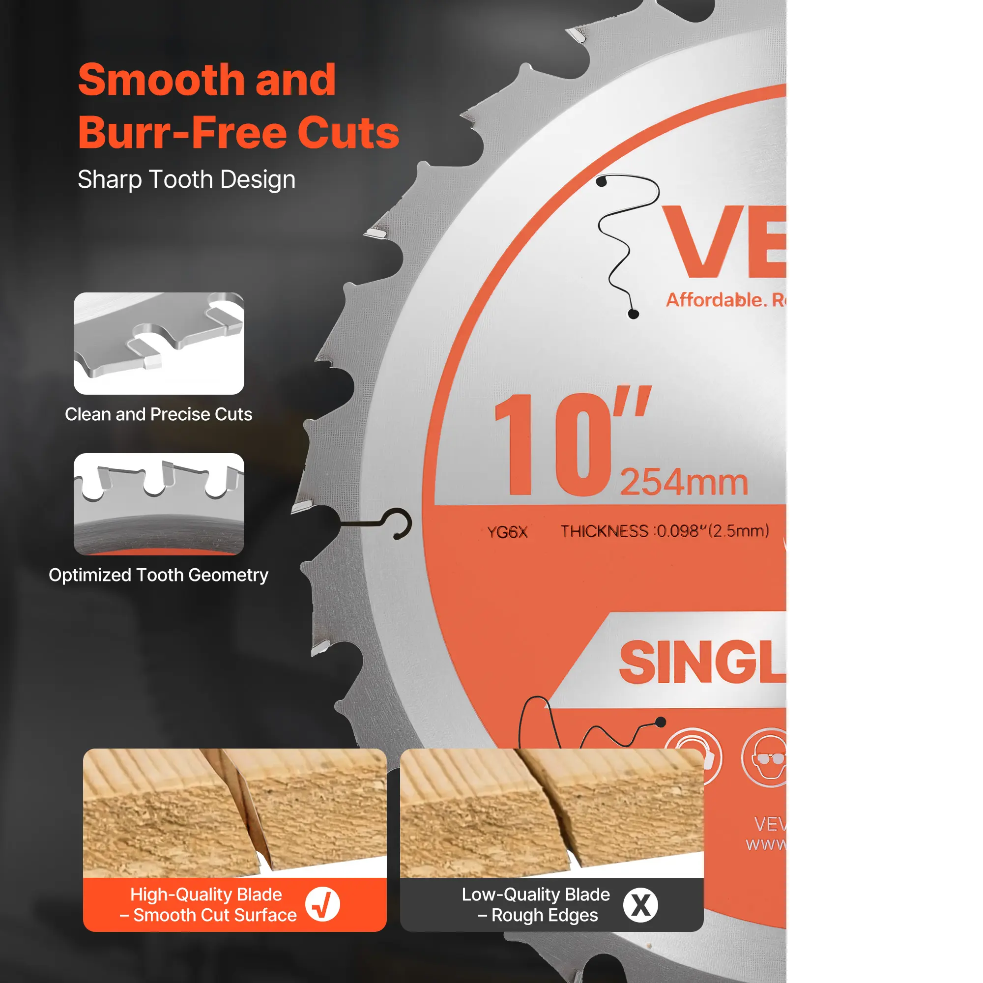 • Premium Alloy Steel: Built from high-hardness alloy steel, this table saw blade stays sharp longer, even when cutting hard materials. It provides strong impact tolerance and stability for smoother, low-vibration cuts