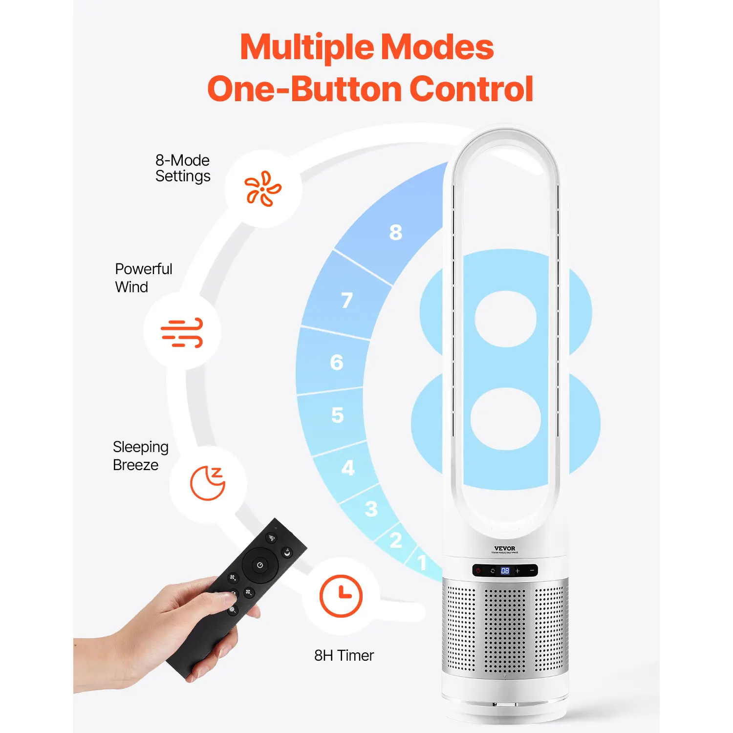 • Versatile Functionality: This floor fan supports multiple modes by one-touch control, offering both touch and wireless remote operation. With 8 speed settings, strong wind, sleep mode, and more, you can easily switch between functions. It also features an 8-hour timer for added convenience