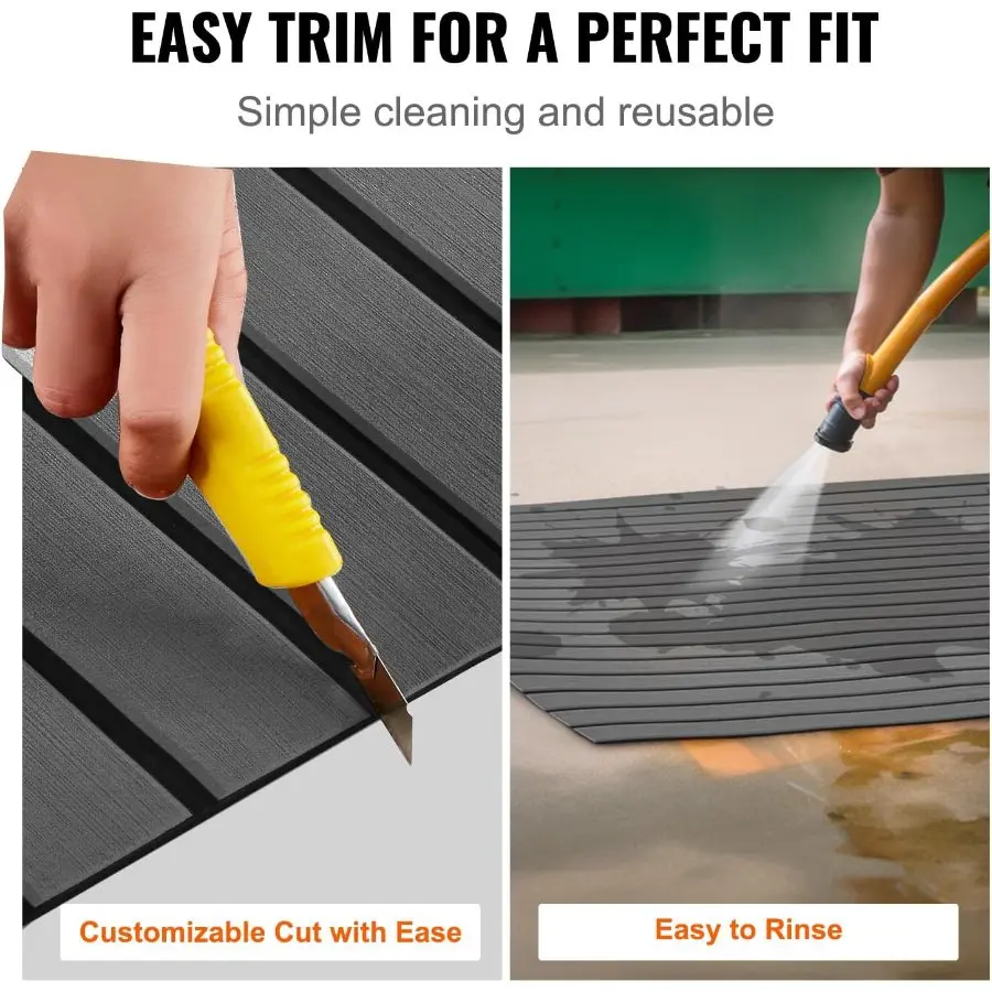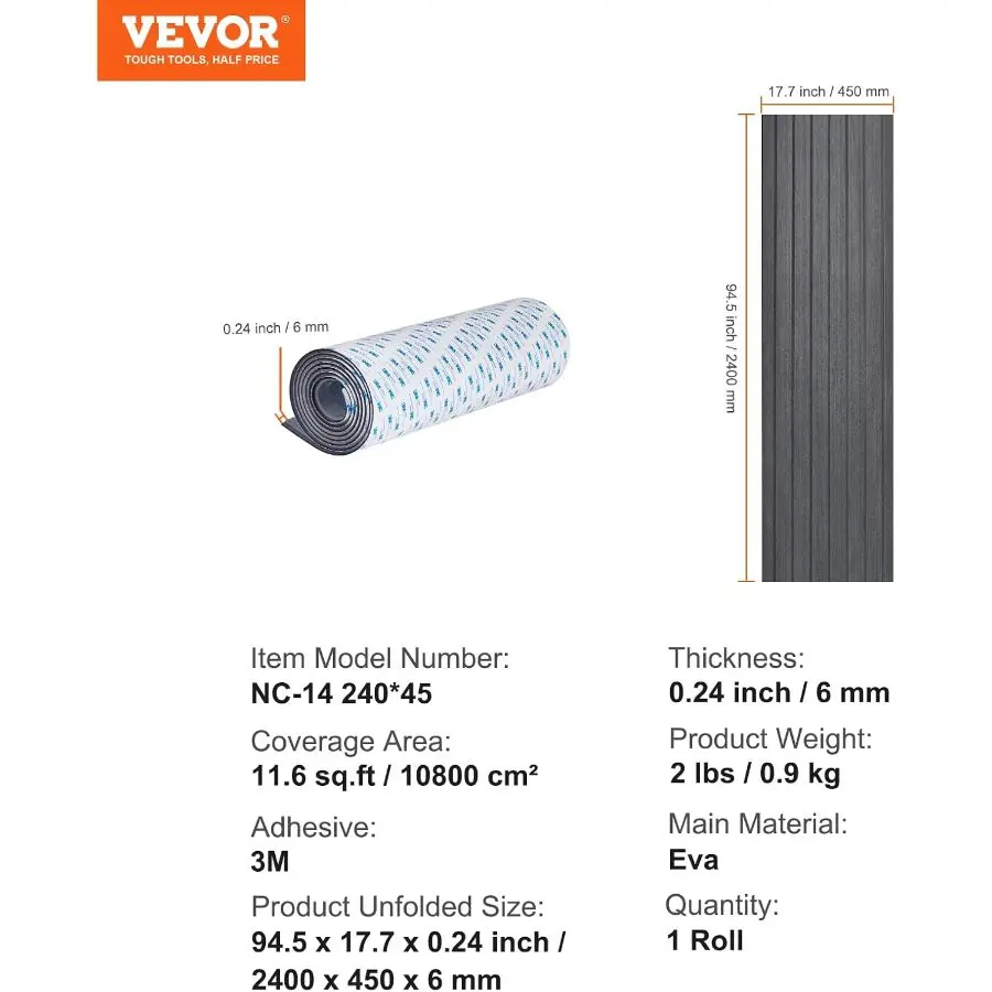 VEVOR Boat Flooring with 3M Adhesive, EVA Foam Boat Decking 94.5x 23.6(2 Rolls) Non - Slip Self - Adhesive Flooring, 31.1sq. ft Marine Carpet for Boats Yacht Pontoon Kayak Decking RV FloorSpecificationsItem Model Number: NC-14 240*45Coverage Area: 11.6 sq.ft / 10800 cm²Adhesive: 3MOperating Temperature: -4~122℉/-20 ~ 50℃Product Unfolded Size: 94.5 x 17.7 x 0.24 inch / 2400 x 450 x 6 mmProduct Weight: 2 lbs / 0.9 kgMain Material: EvaQuantity: 1 RollPackage Content1 x Roll of Boat