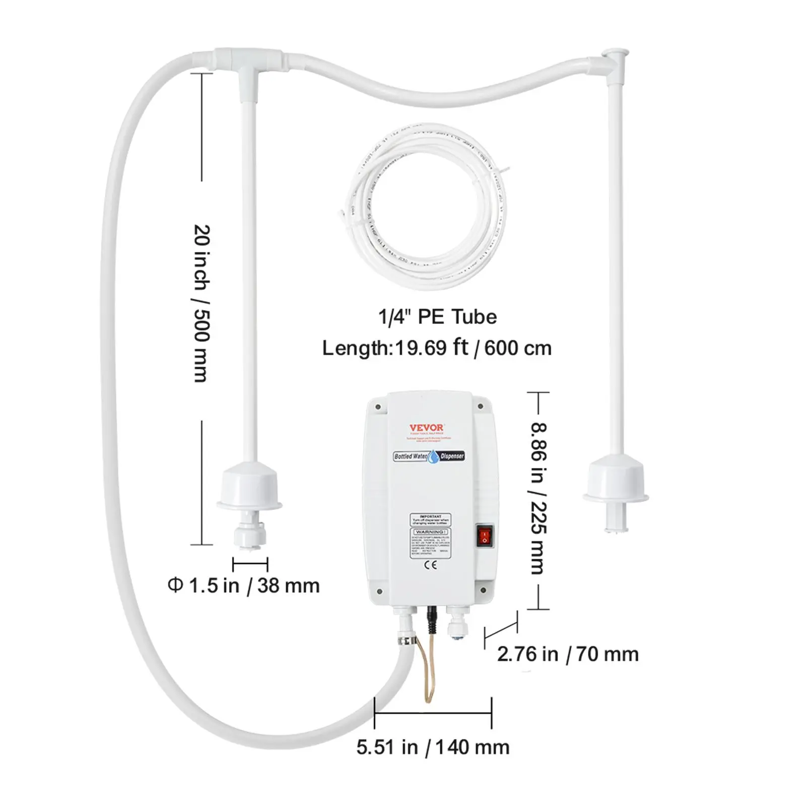 • Wide Voltage Dual-Tube Design: This bottled water dispenser pump system features a wide voltage dual-tube bottled water pump system, suitable for 5-gallon bottled water, delivering drinking water under pressure. It comes with 2 inlet pipes, effectively extending the water usage cycle and reducing the frequency of water changes. Powered by a 100-240V adapter, the wide voltage design eliminates concerns about voltage mismatch, easily adapting to various usage scenarios.