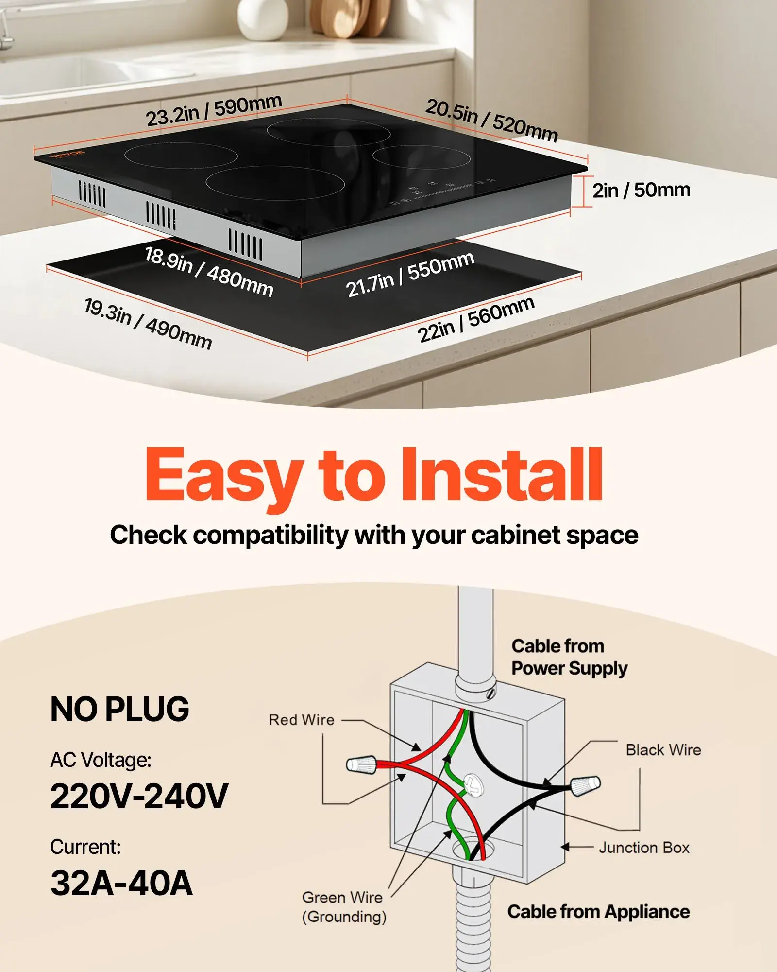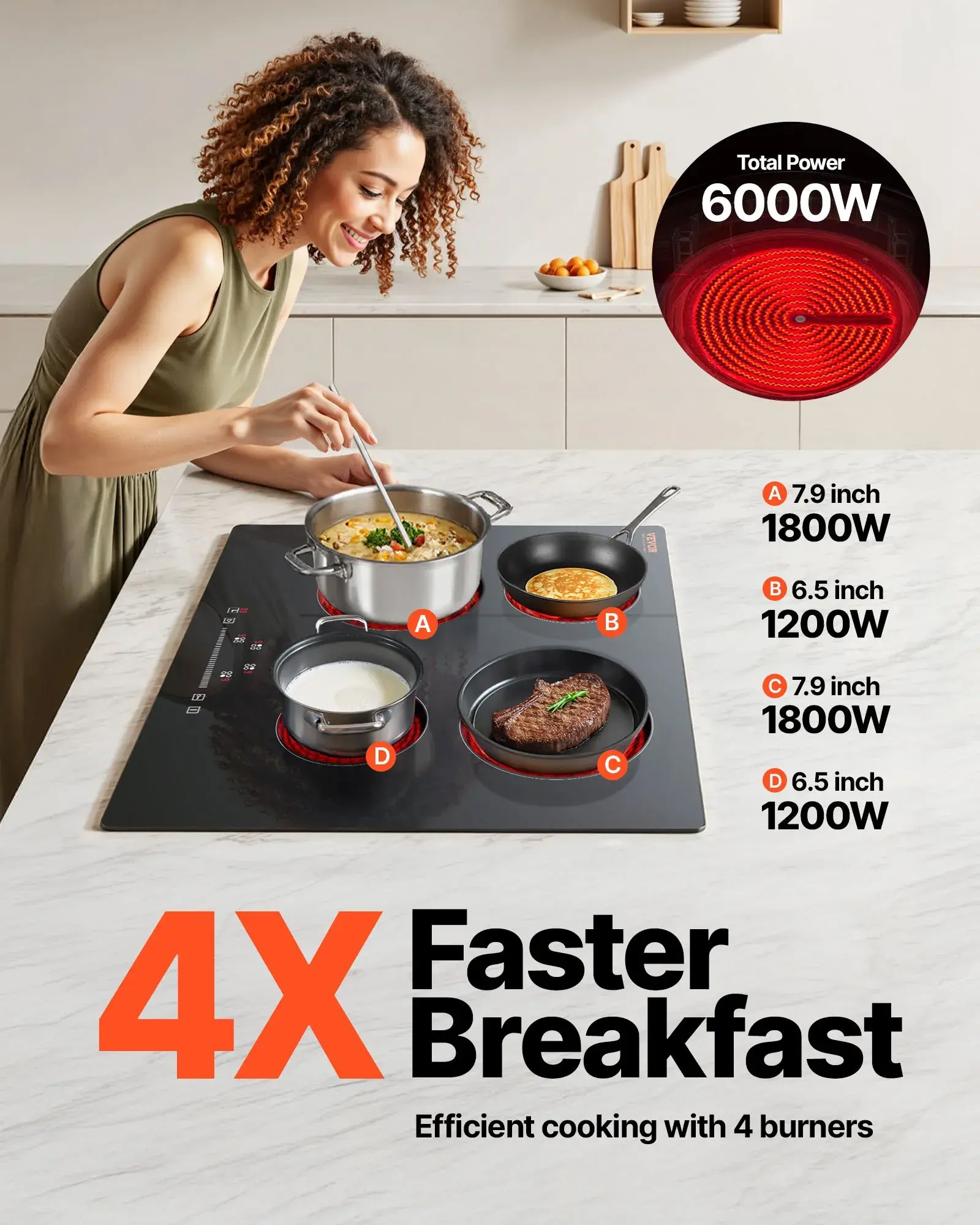 5. VEVOR Built in Electric Stove Top, 23.2 x 20.5 inch 4 Burners, 240V Glass Radiant Cooktop with Sensor Touch Control, Timer & Child Lock Included, 9 Power Levels for Simmer Steam Slow Cook Fry