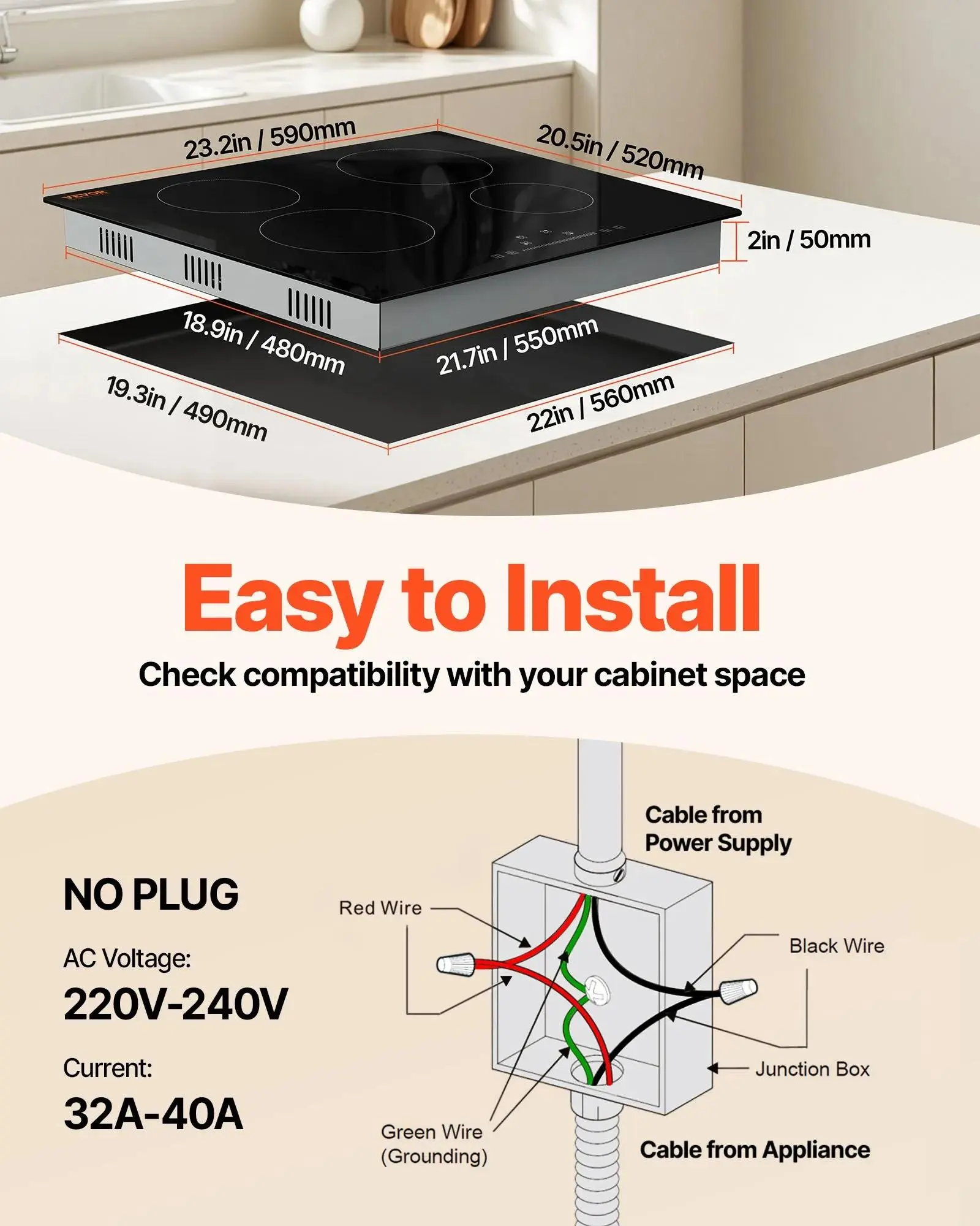 Built-in Design 🏠- 22x19.3-inch Cutout Size: Convenient installation and saves kitchen space.- Suitable Voltages: 220-240V, 60Hz.