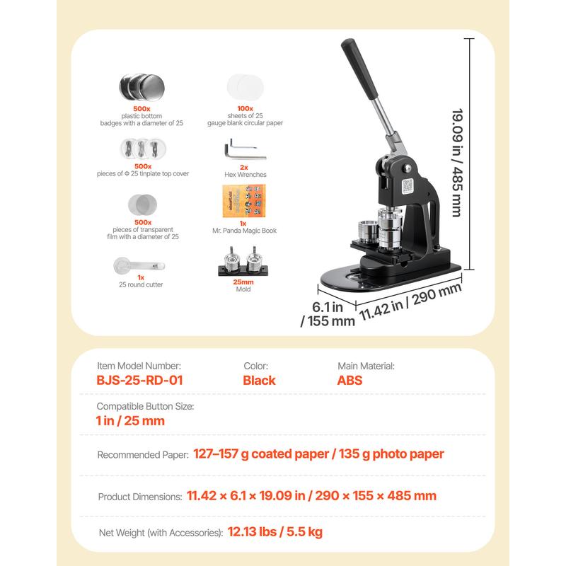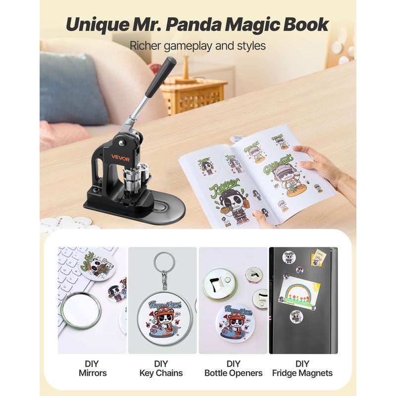 • Comprehensive Kit, Ready to Use: Our button maker machine comes with 500 button parts, 1 circle cutter, and 2 hex wrenches. You'll also receive the unique "Mr. Panda Magic Book" featuring lovely panda patterns. Get ready to create personalized badges
