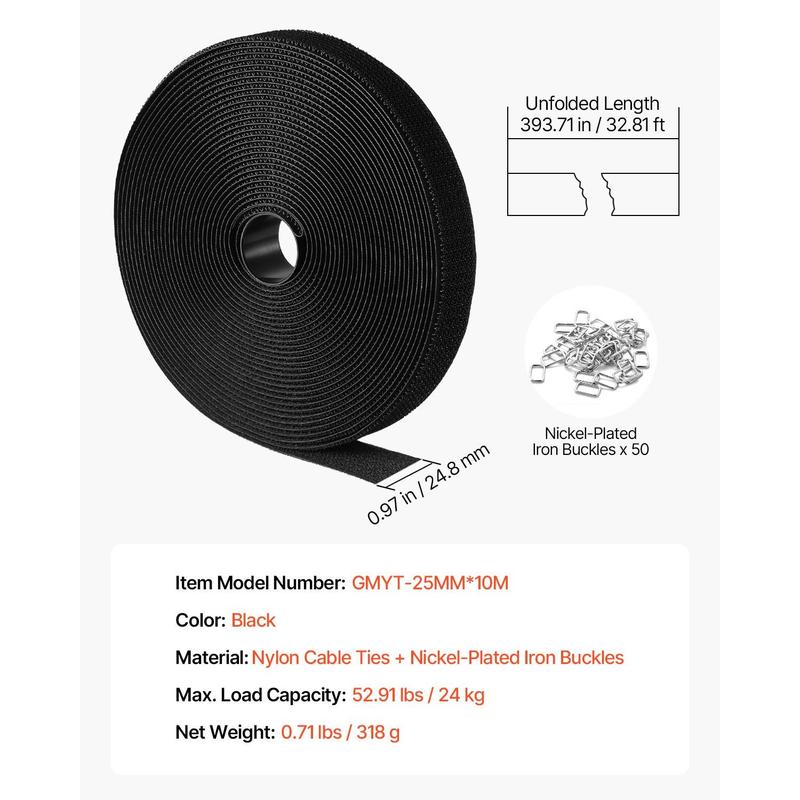 Color: Black,Item Model Number: GMYT-25MM*10M,Max. Load Capacity: 52.91 lbs / 24 kg,Material: Nylon Cable Ties + Nickel-Plated Iron Buckles,Item Length: 393.71 inch / 10 m,Net Weight: 0.71 lbs / 318 g,Item Width: 0.97 inch / 24.8 mm