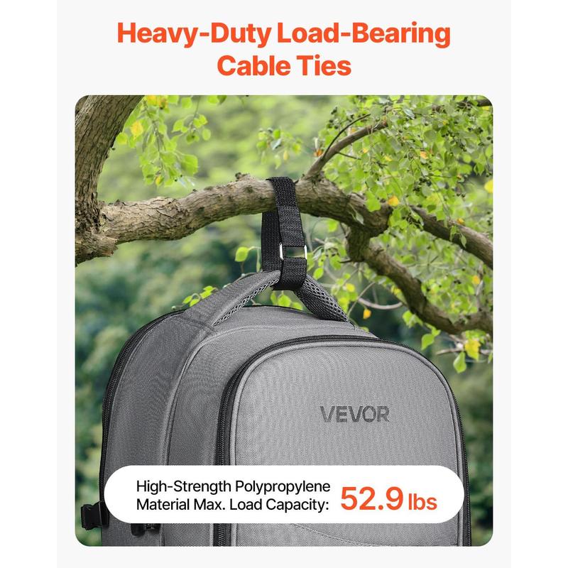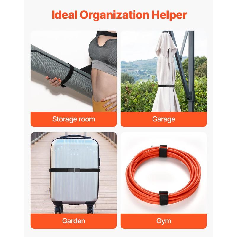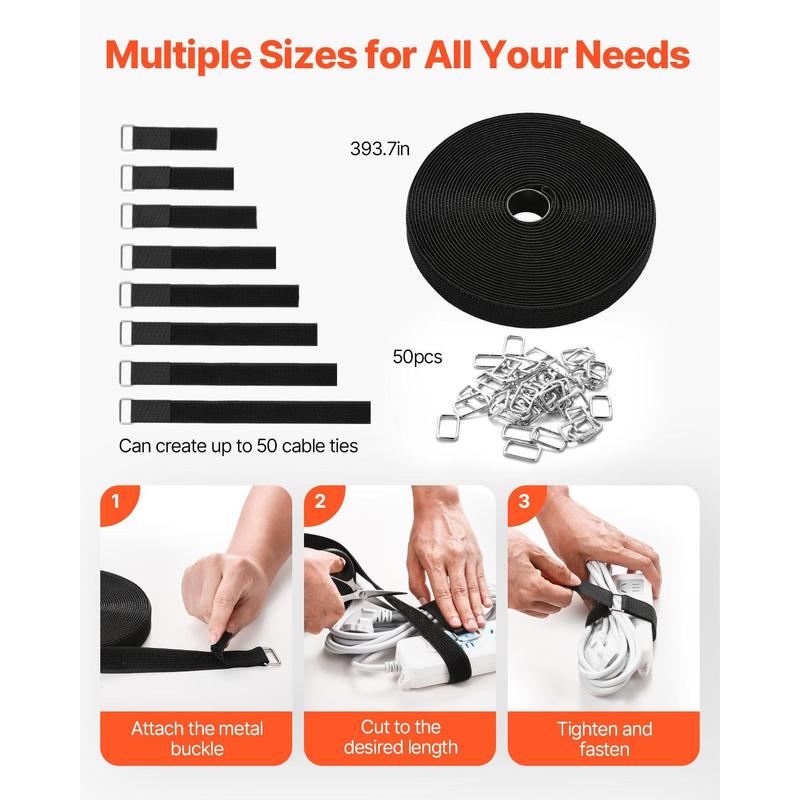 Premium Material: These Velcro straps are made from high-quality nylon material and feature sturdy metal buckles, capable of bearing up to 52.91 lbs / 24 kg.They are designed to secure heavy items without distortion.The self-adhesive straps offer strong adhesion and are not easy to fall off, making them reusable multiple timesCustomizable Length: You can cut the straps to the desired length to ensure that these velcro cable ties flawlessly fit different objects, reducing waste.Whether bundling cables, securing items, or using them for other purposes, they deliver optimal results for both indoor and outdoor useEasy to Use: Simply thread the adjustable strap through the metal buckle, adhere it in the opposite direction, and then cut it to the appropriate length.You can create up to 50 hook-and-loop strapsMulti-Functional Application: Our cable ties are not only efficient for organizing and securing various items such as cables, wires, umbrellas, books, suitcases, camping gear, and sewing tools, but also help manage tangled wires from appliances in use, reducing security hazardsEssential Household Organizer: For those who enjoy hands-on problem-solving, this heavy-duty velcro roll is a practical tool. Whether for home storage, outdoor activities, or DIY projects, it can come in handy. It's also a great idea for family and friends, helping to declutter and organize efficientlyVEVOR Cable Ties, 393.7-Inch Adjustable Hook and Loop Straps with 50 Metal Buckles, Reusable Velcro Cords Straps, Cut-to-Length Wire Strap, Heavy-Duty Nylon Cord Ties for Organizer and Management