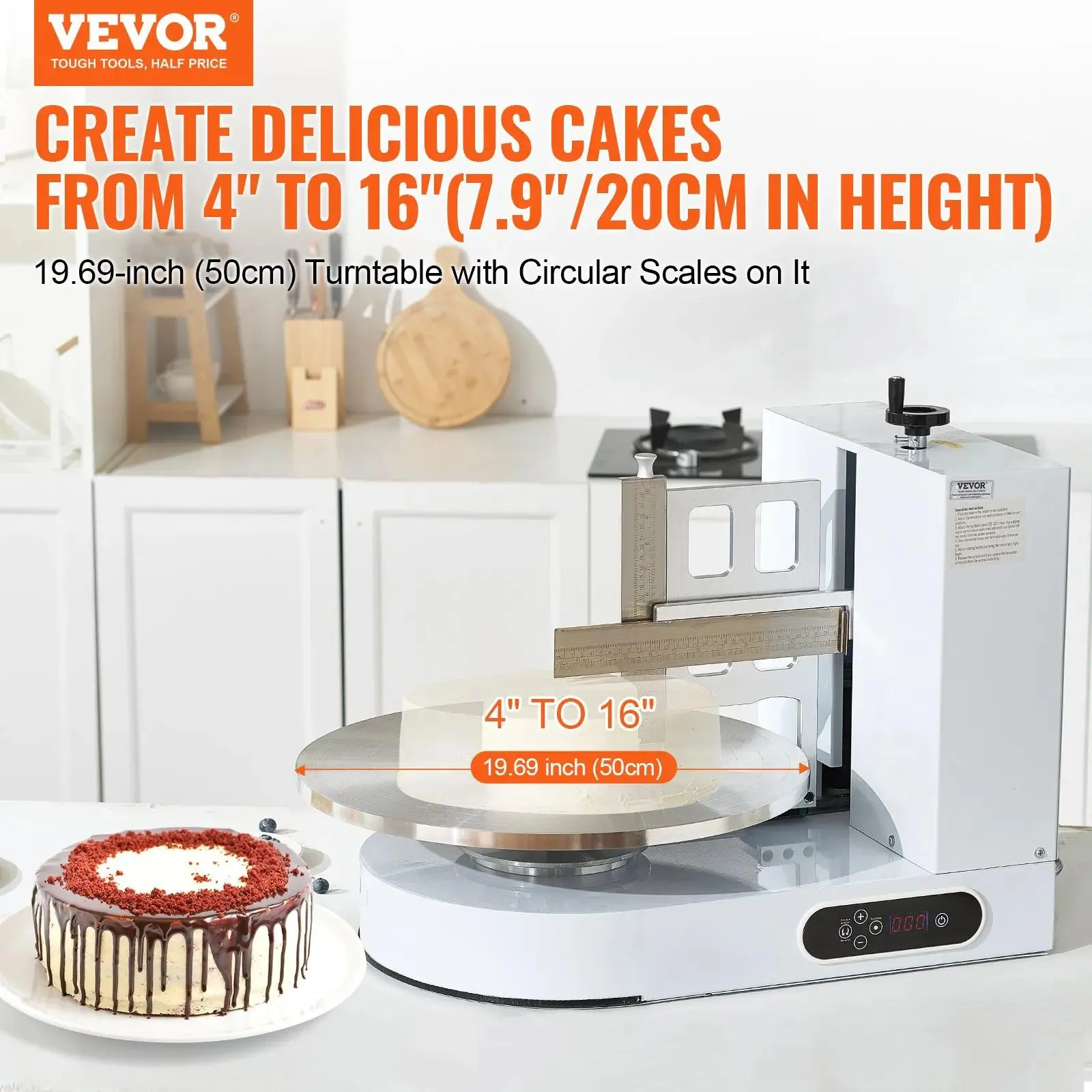 Elevate your cake decorating game with the VEVOR Cake Decorating Machine. This versatile tool spreads cream, coats, and smears with ease. Perfect for cakes ranging from 4" to 16", it features a turntable with an adjustable scraper. The machine operates at a low noise level, ensuring a peaceful baking experience. Ideal for both home bakers and professionals.