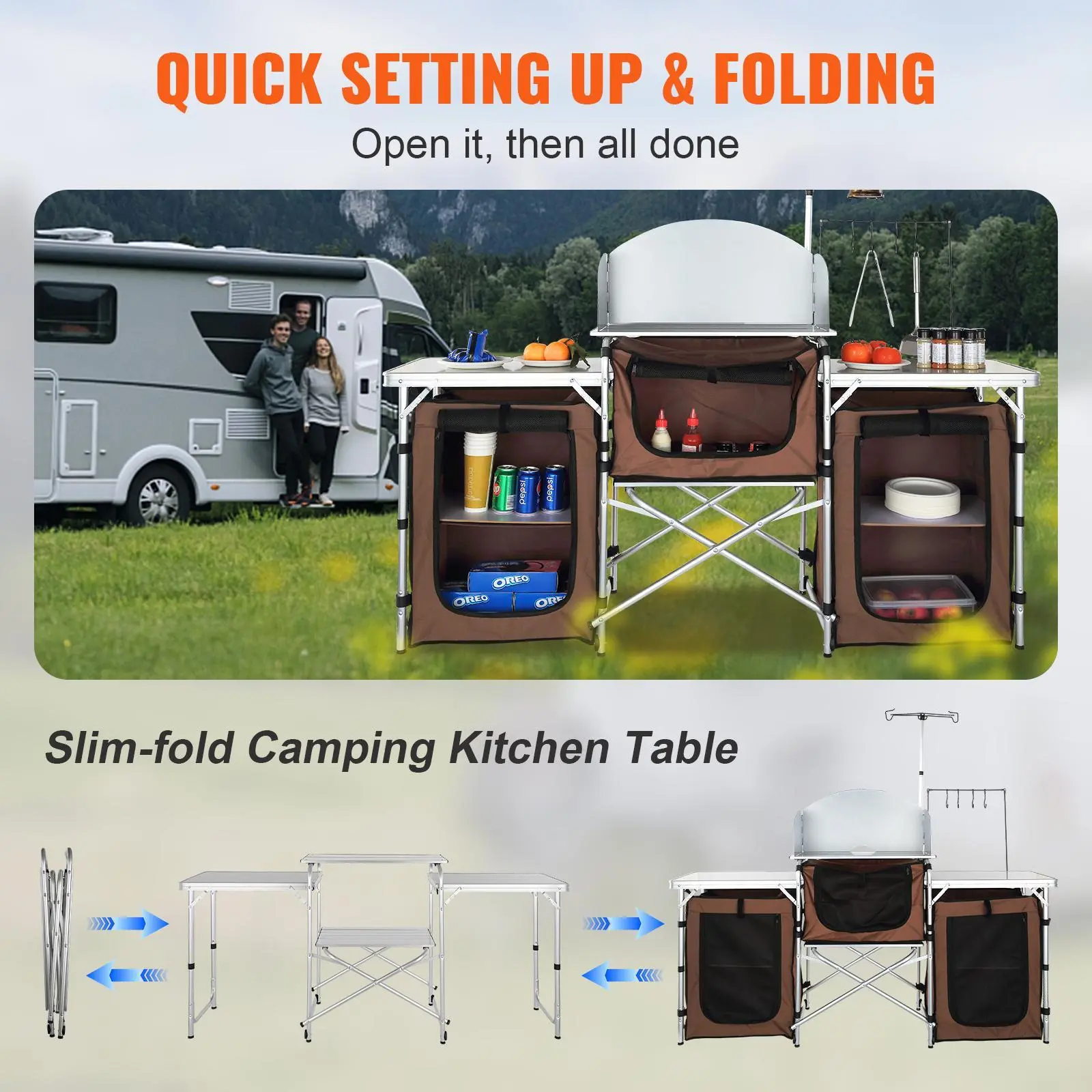 • Ready for Any Adventure: Whether you're RV traveling, camping, picnicking, hosting a backyard BBQ, or just enjoying a night under the stars, our camping table is the ideal solution for all your outdoor needs. It provides a sturdy surface for placing and storing items while enhancing your overall outdoor experience.