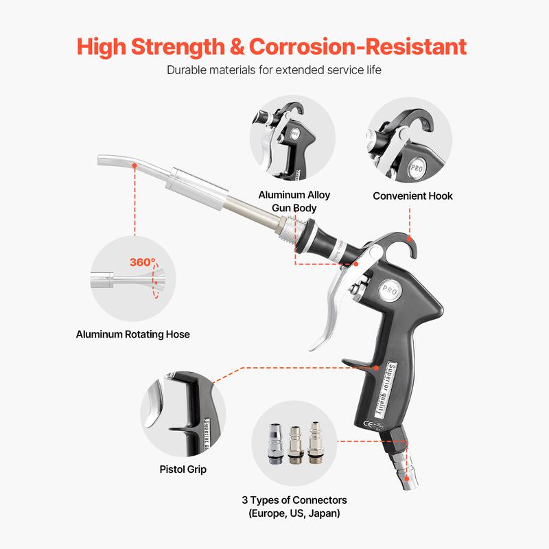 • Durable & Corrosion-Resistant: The aluminum alloy body of this air compressor gun is durable and includes a convenient portable hook for easy storage. The aluminum rotating hose enhances flexibility, and the ergonomic pistol-style grip helps reduce fatigue during long periods of use.