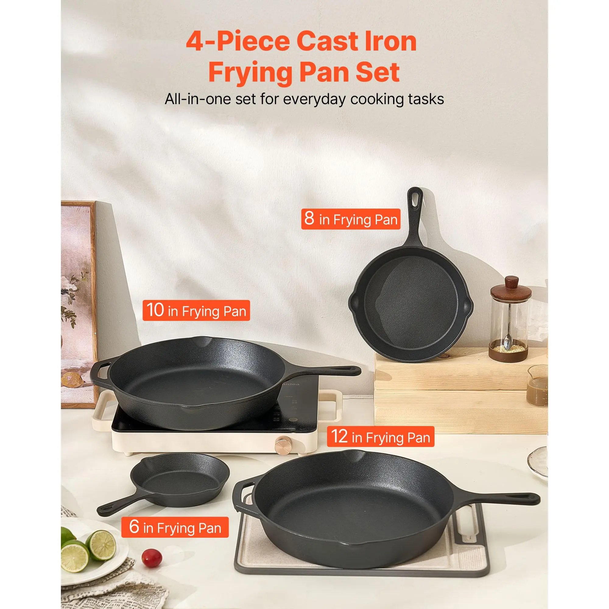 • Our skillet set includes 6, 8, 10, and 12-inch cast iron pans. They offer excellent heat retention and even heating. Cook quickly while preserving the natural flavor and nutrients of your ingredients. Perfect for any kitchen enthusiast.