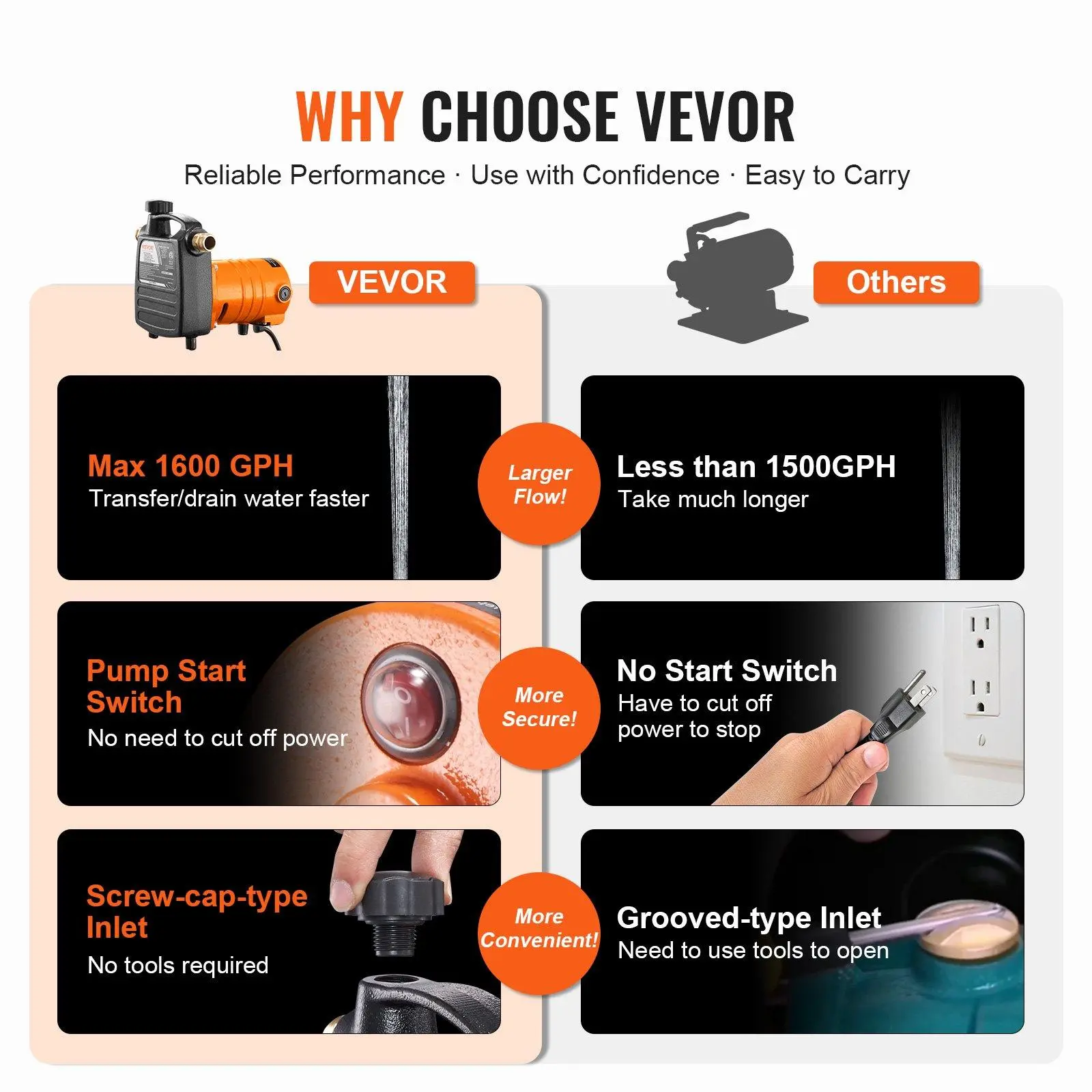 This electric utility pump comes with a 10 ft power cord to meet the needs of a wider range of usage. Bid farewell to the limit of the power socket.