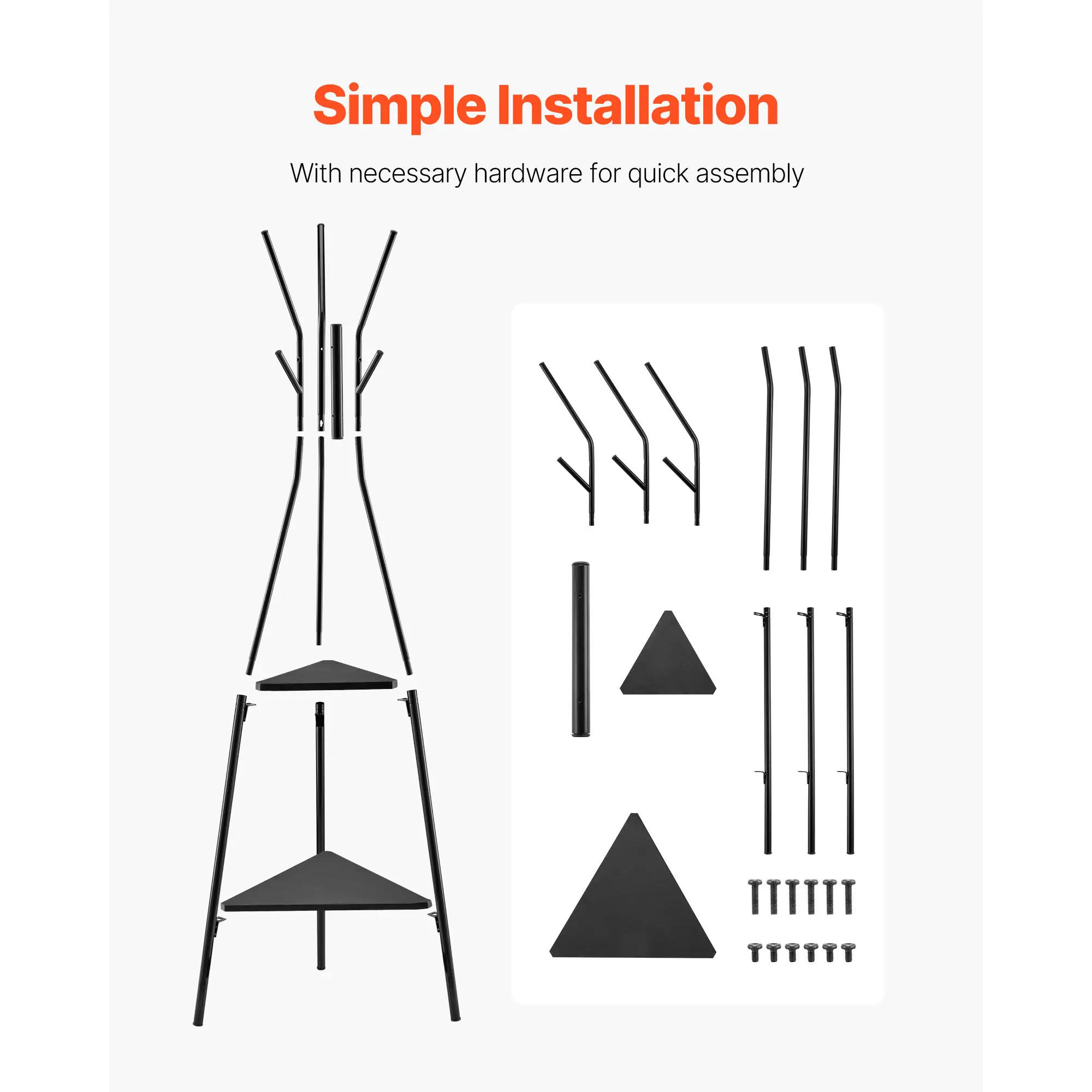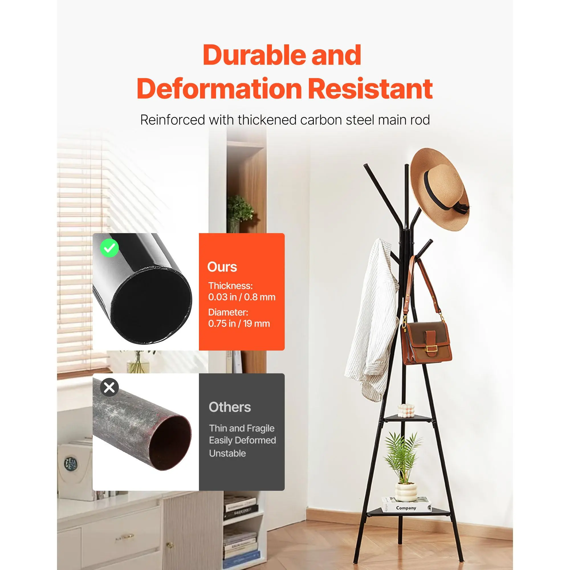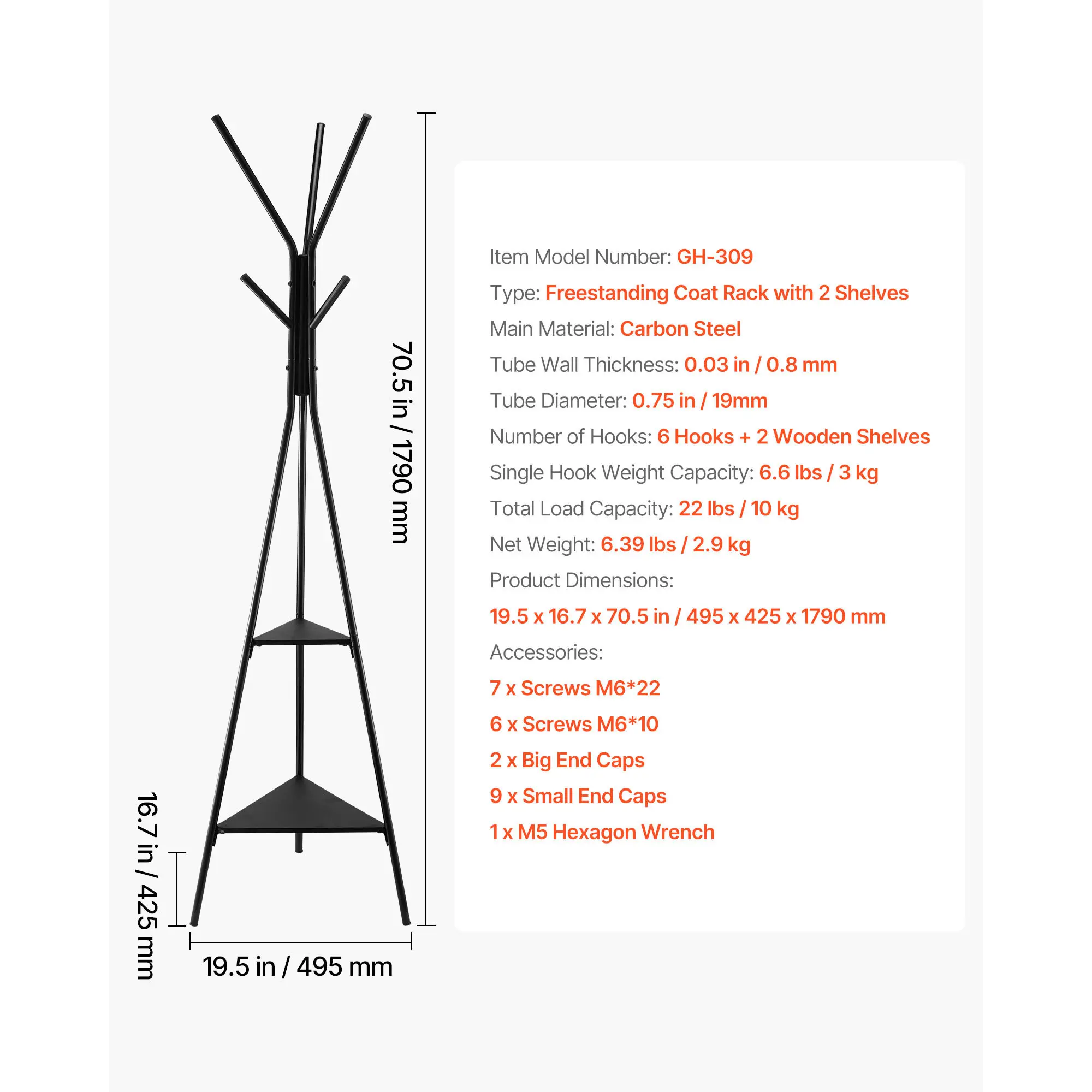 • Strong Load Capacity: Create a tidier home space with VEVOR coat rack. It features a stable triangular structure, 6 hooks, 2 storage shelves, and a thickened carbon steel main rod. Each hook holds up to 6.6 lbs (3 kg), with a total capacity of 22 lbs (10 kg), providing stable support for hanging coats, hats, bags, and more