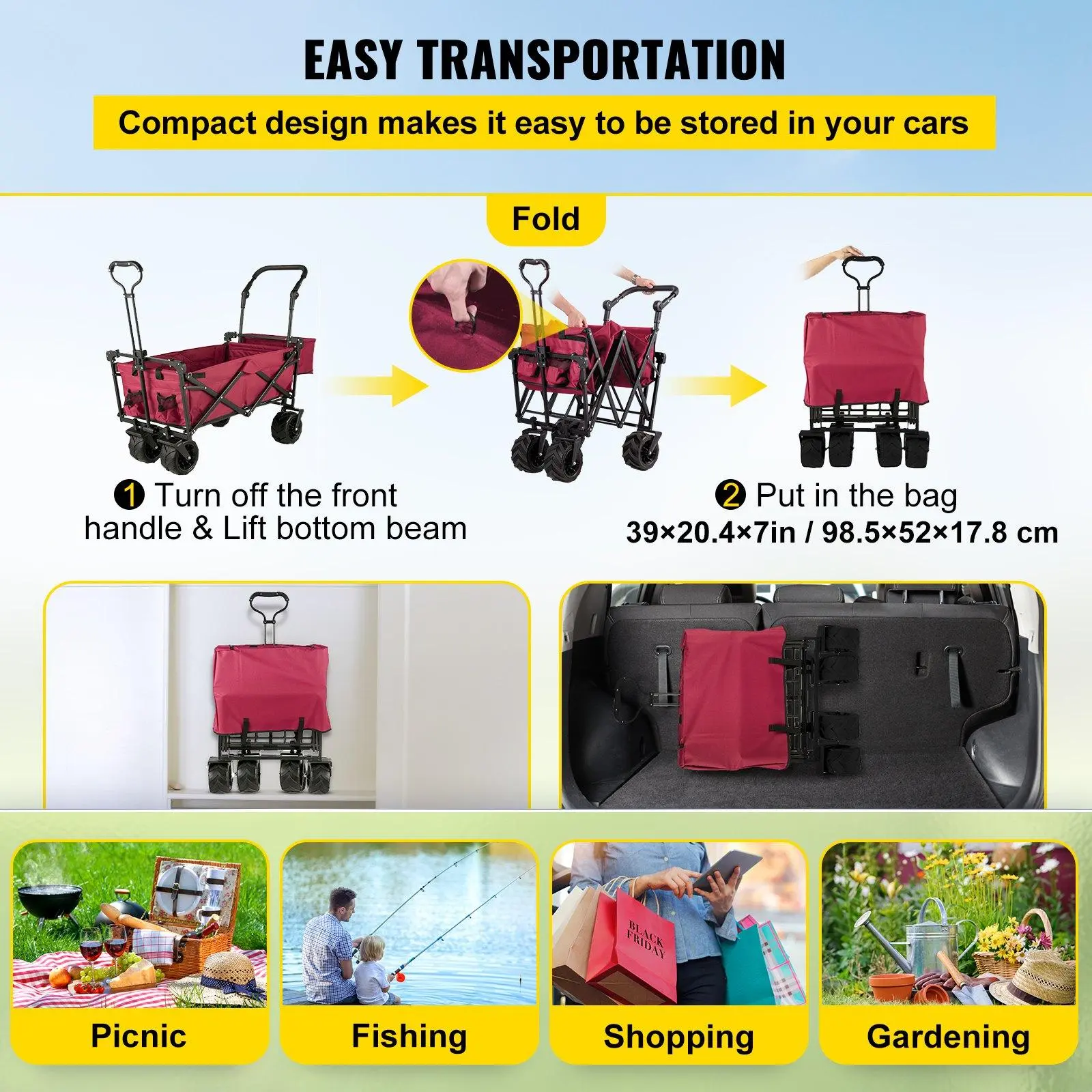 ·Easy to Fold/Unfold: No assembly required. It can become extremely compact in simple steps, allowing you to store it in the trunk of your car! With this wagon cart's help, you can get rid of backache from carrying too much stuff.
