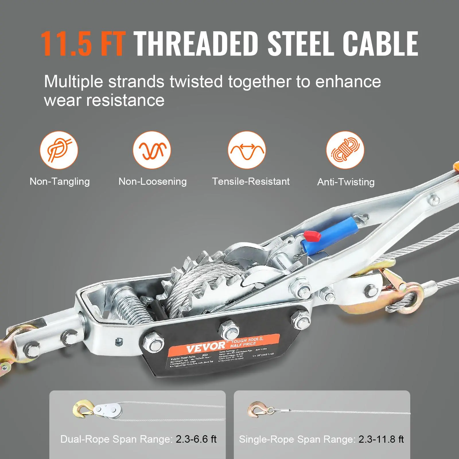 • 11.5 ft Steel Cable: Say goodbye to tangles and hello to convenience with our 11.5 ft steel cable winch puller. Whether you're hauling materials over a long distance or pulling with all your might, switch effortlessly between single or double rope modes. Our premium steel cable's got your back!