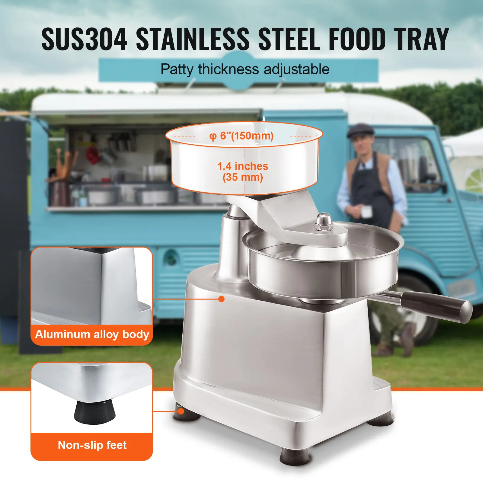 • Food Tray: With a diameter of 6" (150mm), you can make uniformly sized patties. Patty thickness is adjustable based on the amount of meat used. Food tray thickness is 1.4" (35mm).