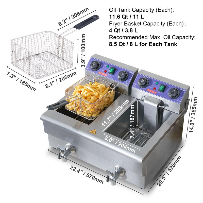 • Large Capacity: With two separate oil tanks (Water Capacity: Max 11.6Qt/11L each, Oil Capacity: Max 8.5Qt/8L each), this commercial electric deep fryer allow you fry different types of foods individually and maintain distinct flavors. Perfect for delis, concession stands, snack bars, and parties.