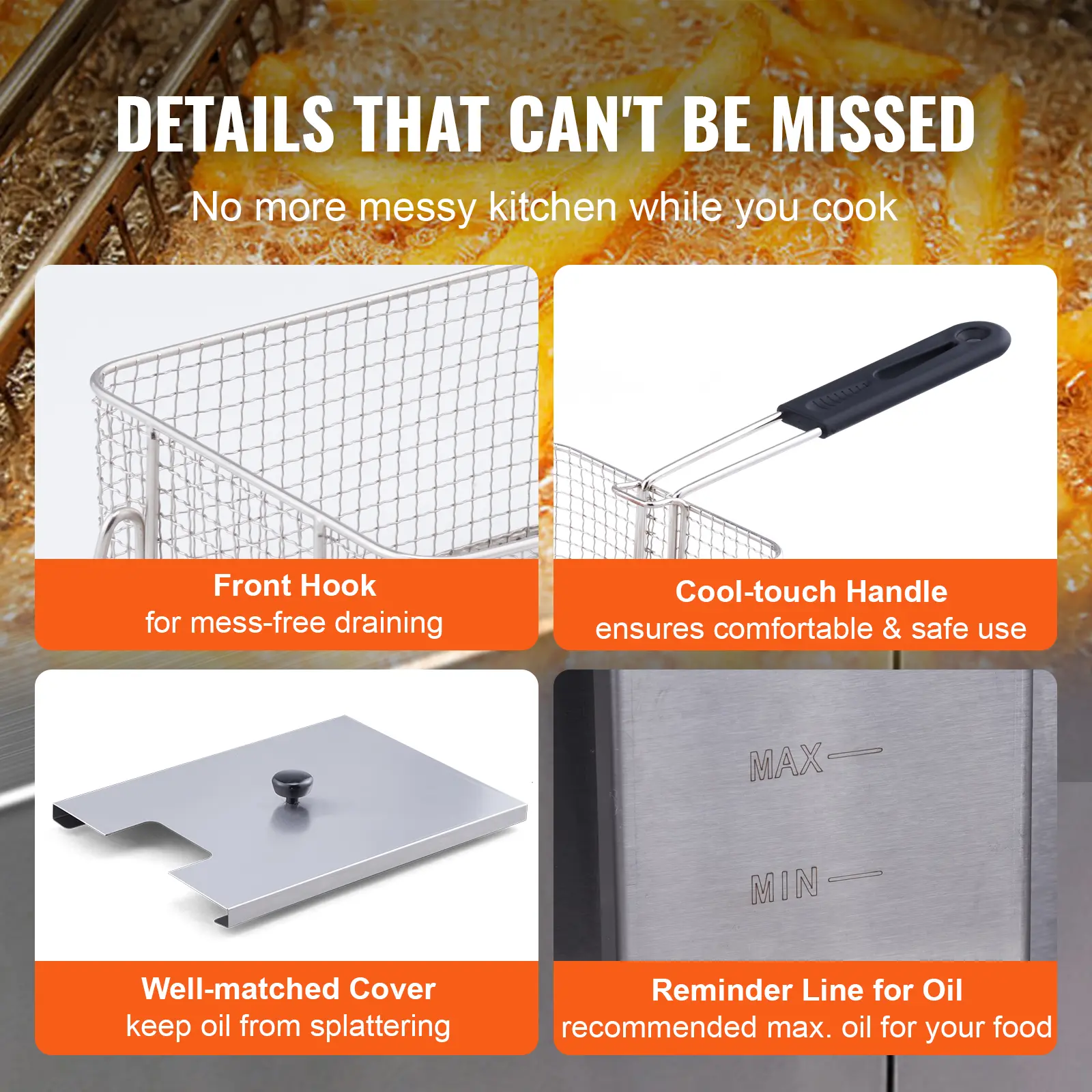 • Detailed Just for You: A coated, cool-touch handle ensures comfortable use, while the well-matched cover minimizes hot oil splashes. Additionally, the front hook makes it easy to hang the basket up to drain oil quickly.