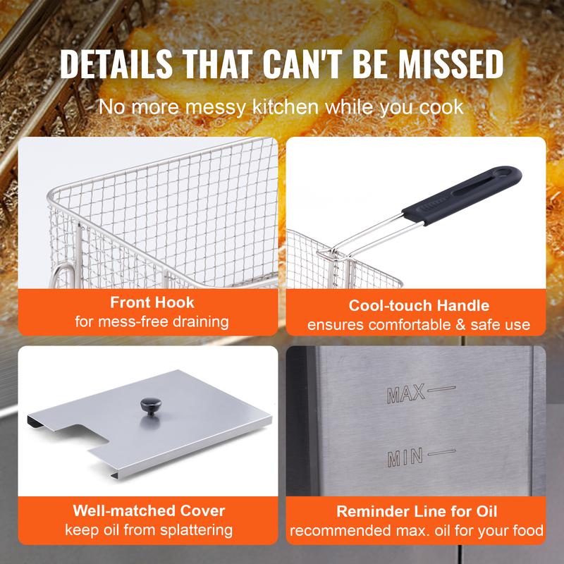 • Hot Food in No Time: Aren't you tired of slow heat-ups? This commercial electric fryer is equipped with dual heating elements, allowing it to heat oil to your desired temperature in a short time. It's about to get hot! You can easily cook your food quickly and thoroughly.