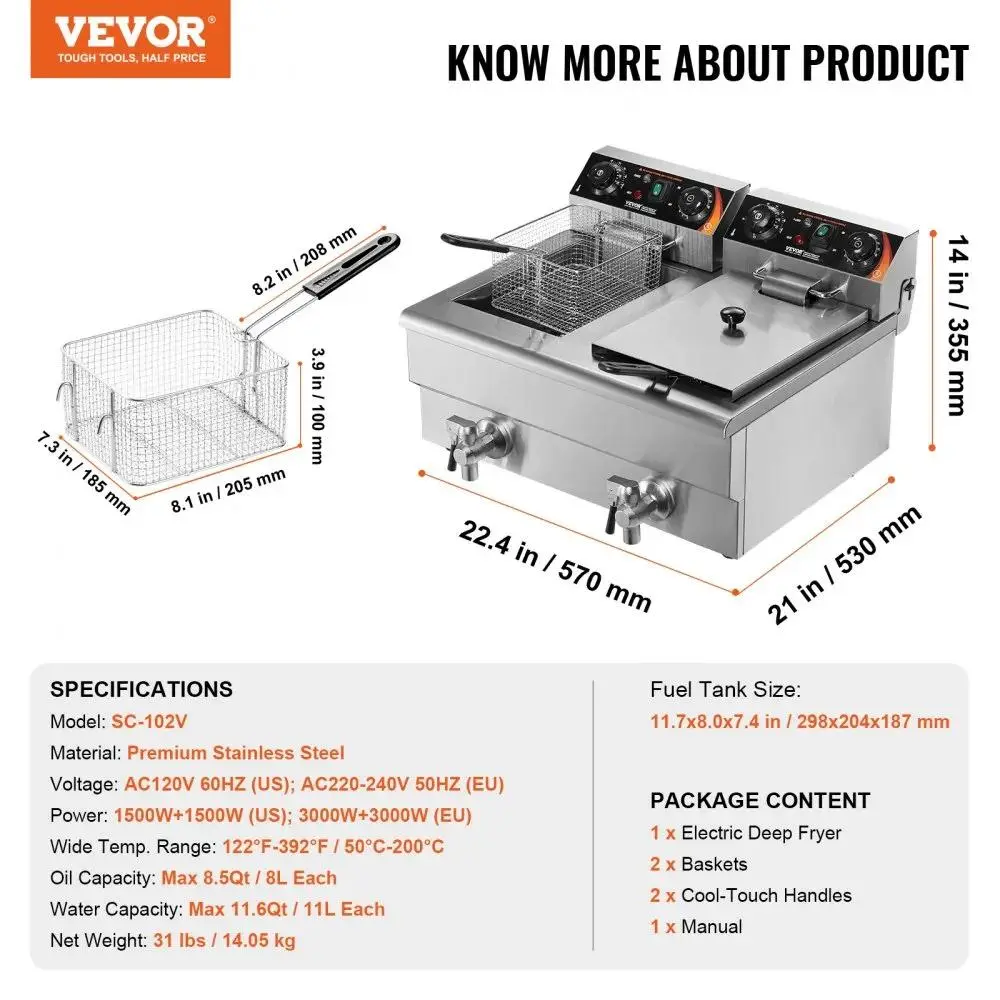 The VEVOR Commercial Deep Fryer is a powerful electric countertop fryer, perfect for commercial kitchens and restaurants. It features dual tanks with a total capacity of 2 x 11.6Qt/11L. The stainless steel construction ensures durability and easy cleaning. This fryer includes a basket for efficient food frying. Ideal for large-scale cooking needs.