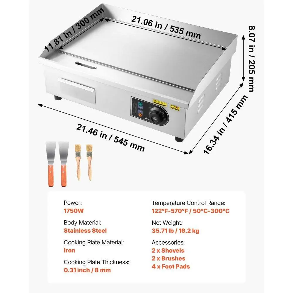 VEVOR Commercial Electric Griddle, 21 x 11.8 inch, 1750W, 122-570°F Adjustable Temp Control, Stainless Steel Countertop Flat Top Grill with 2 Spatulas, 2 Brushes and 4 Foot Pads, for Steak, Pancake